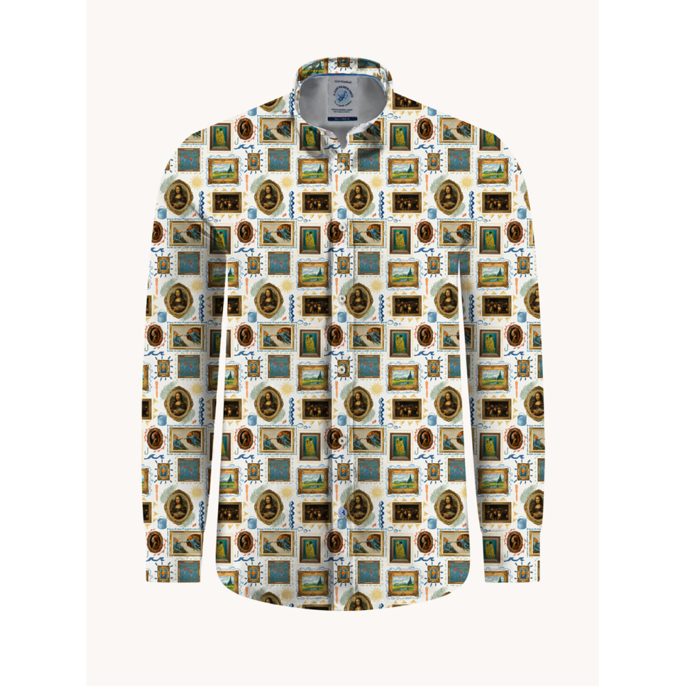 Dit overhemd van A Fish Named Fred is een echte blikvanger met het all-over dessin met iconische schilderijen en lijsten dat doet denken aan een kunstgalerie. Het overhemd combineert creativiteit met comfort en is afgewerkt met de kenmerkende Fred-details zoals een contrasterende kraag en geborduurd logo aan de binnenzijde van het manchet.