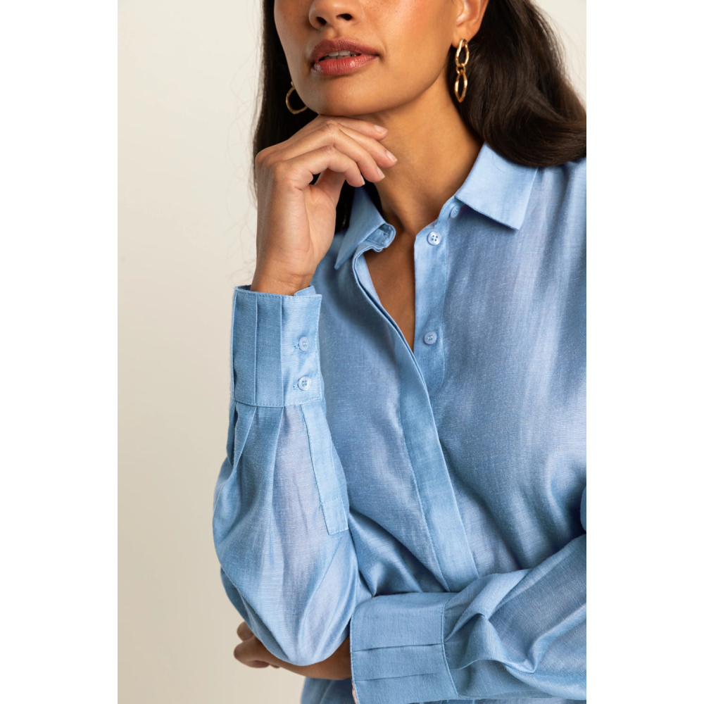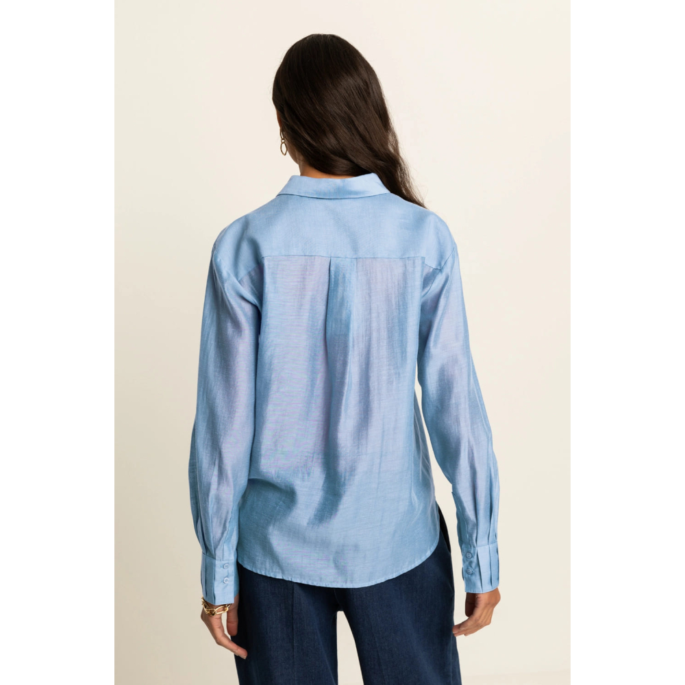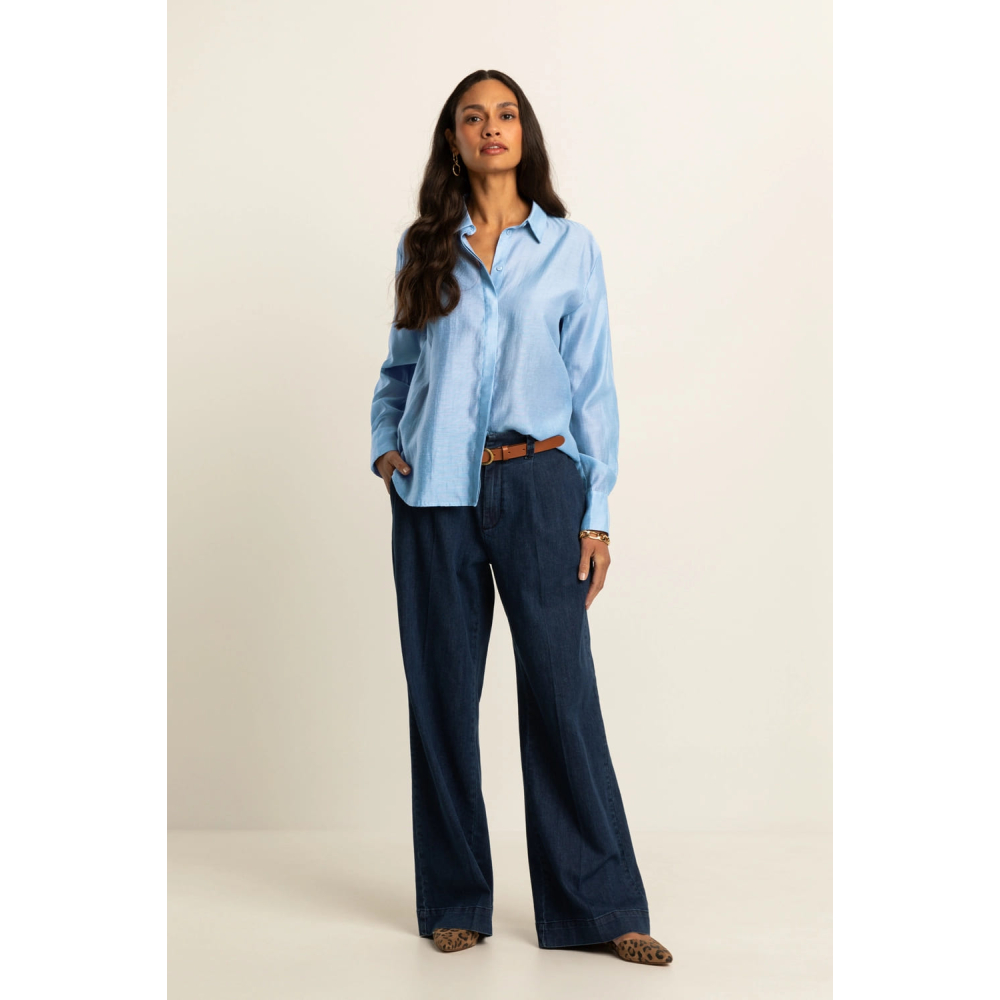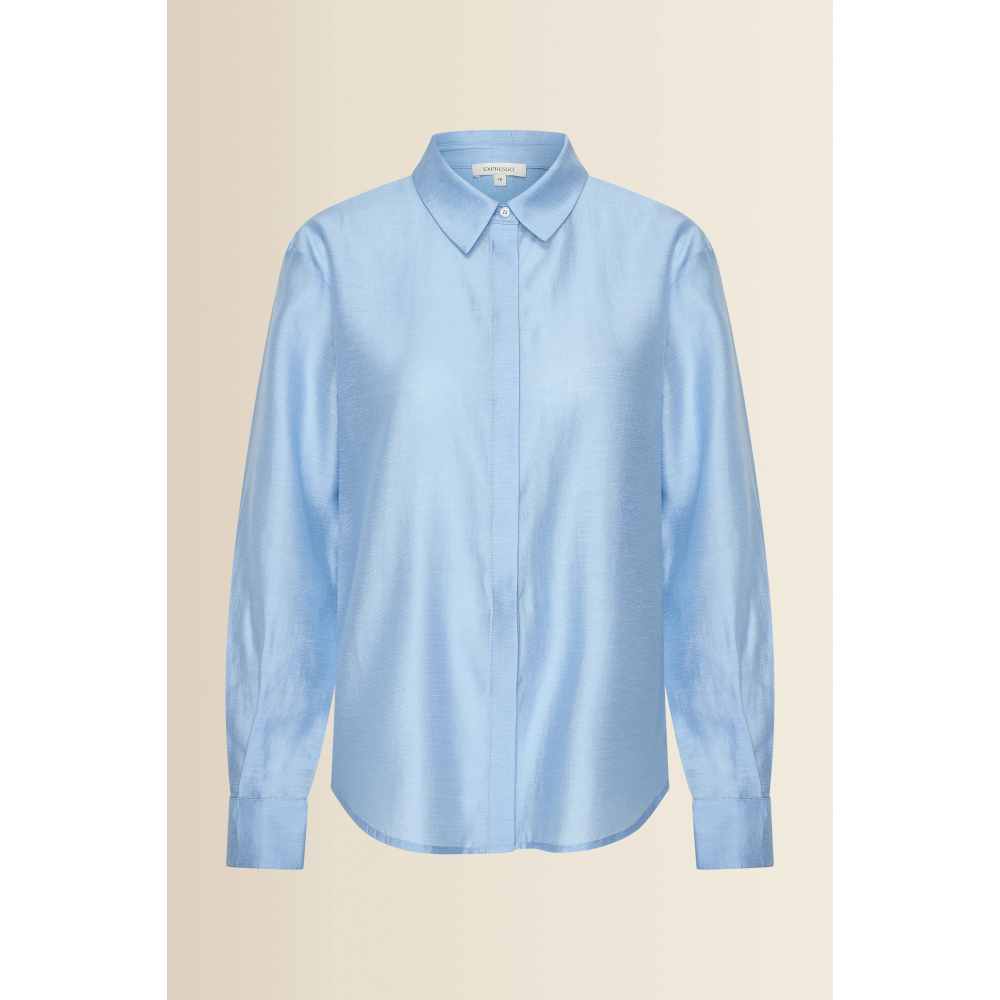 Elegante blouse van Expresso met een vrouwelijke, ontspannen fit en een luxe uitstraling. De soepelvallende stof heeft een subtiele glans die direct zorgt voor een verzorgde look. De klassieke kraag, blinde knoopsluiting en lange mouwen met manchetten geven dit item een tijdloos karakter met een moderne twist.