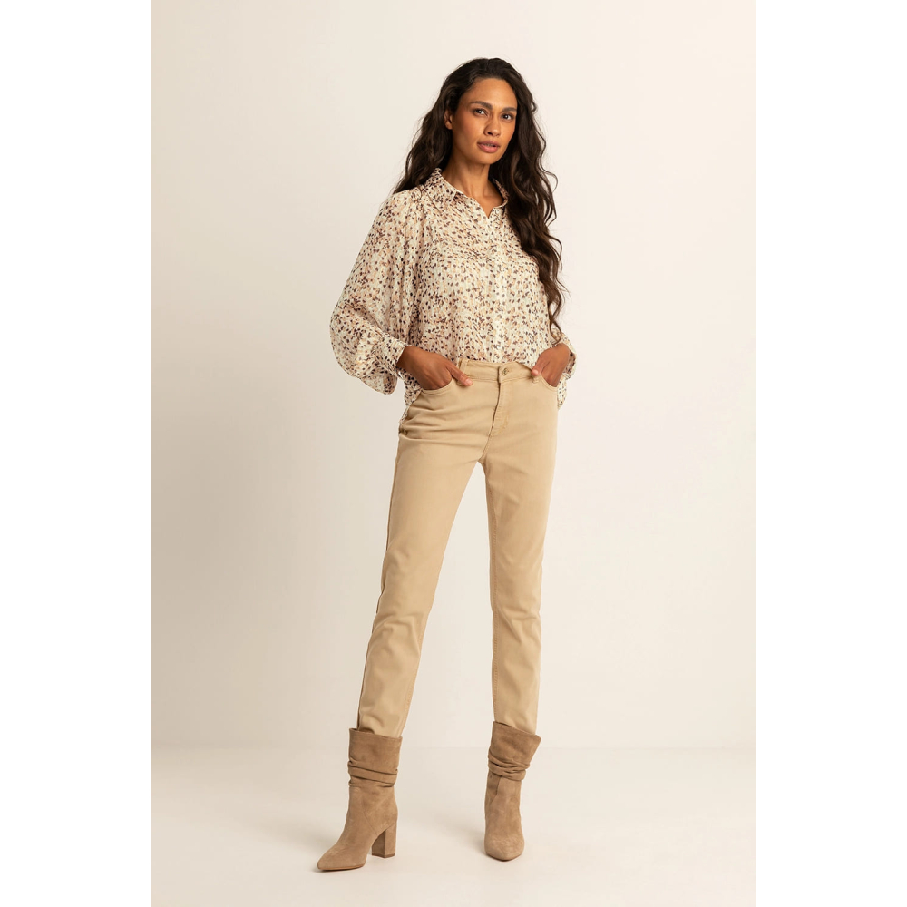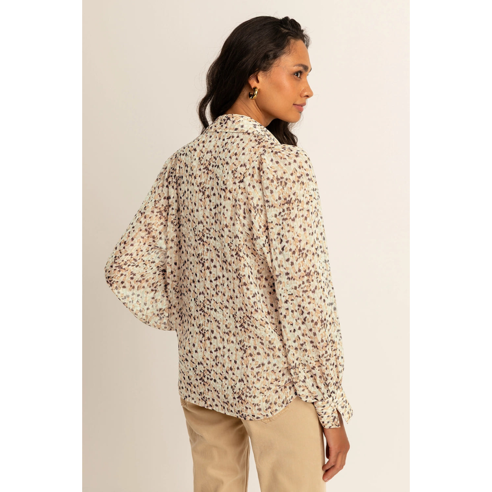 Lichtgewicht en soepelvallende blouse van Expresso met een verfijnde kraag, doorknoopsluiting en lange mouwen met manchetten. De subtiele plooistructuur en all-over print in zachte beige- en paarstinten geven de blouse een speels en vrouwelijk karakter. Perfect voor een gelaagde look onder een blazer of casual op een jeans.