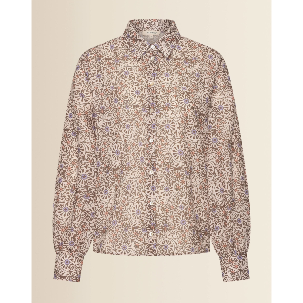 Elegante blouse van Expresso met een all-over print en verfijnde structuur. Deze luchtige blouse heeft een vrouwelijke uitstraling dankzij de zachte plooien bij de schouder en de subtiel gebloemde print in rustige natuurtinten. De rechte pasvorm en licht transparante stof zorgen voor een elegante, comfortabele look die je moeiteloos draagt van werkdag tot weekend.