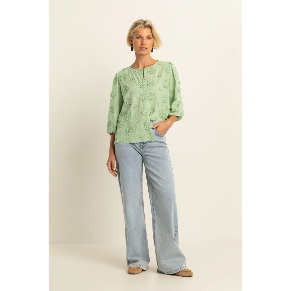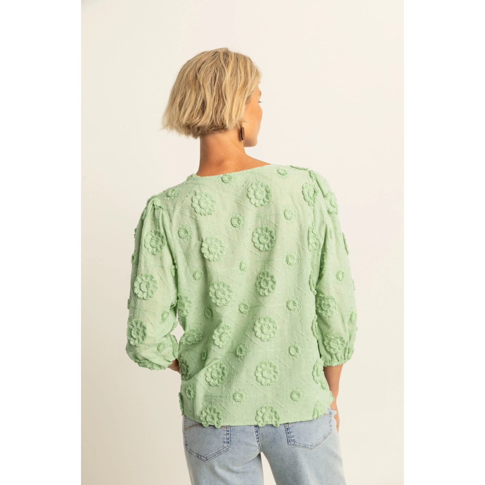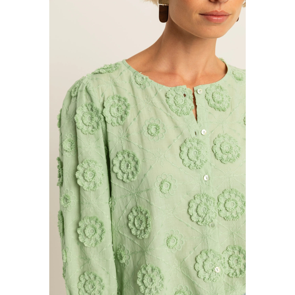 Deze elegante blouse van Expresso met een rijke 3D bloemstructuur is een echte eyecatcher. Relaxed & vrouwelijk, met een ronde hals en een V-split met knoopsluiting. De 3/4 mouwen vallen soepel en geven volume, terwijl de all-over bloemenapplicaties jouw outfit meteen van laten spreken.