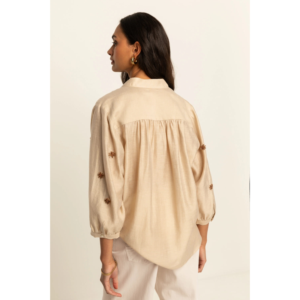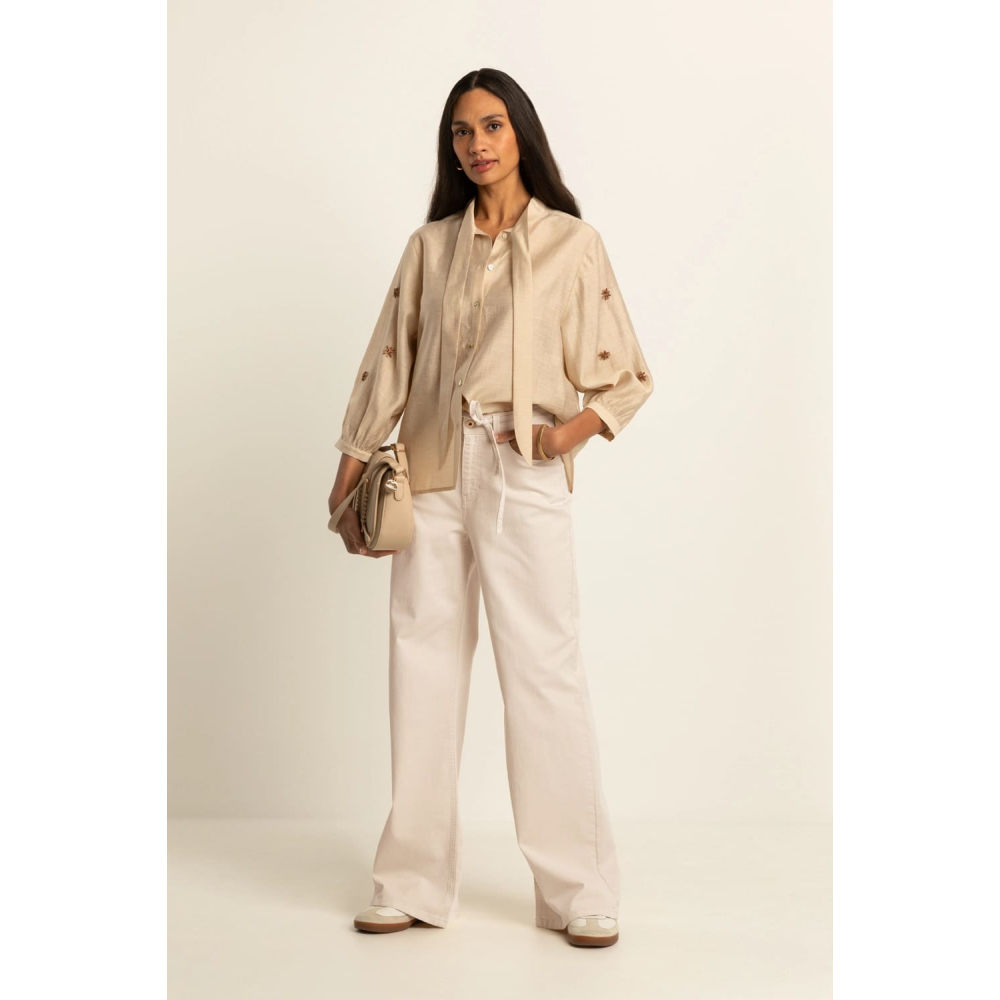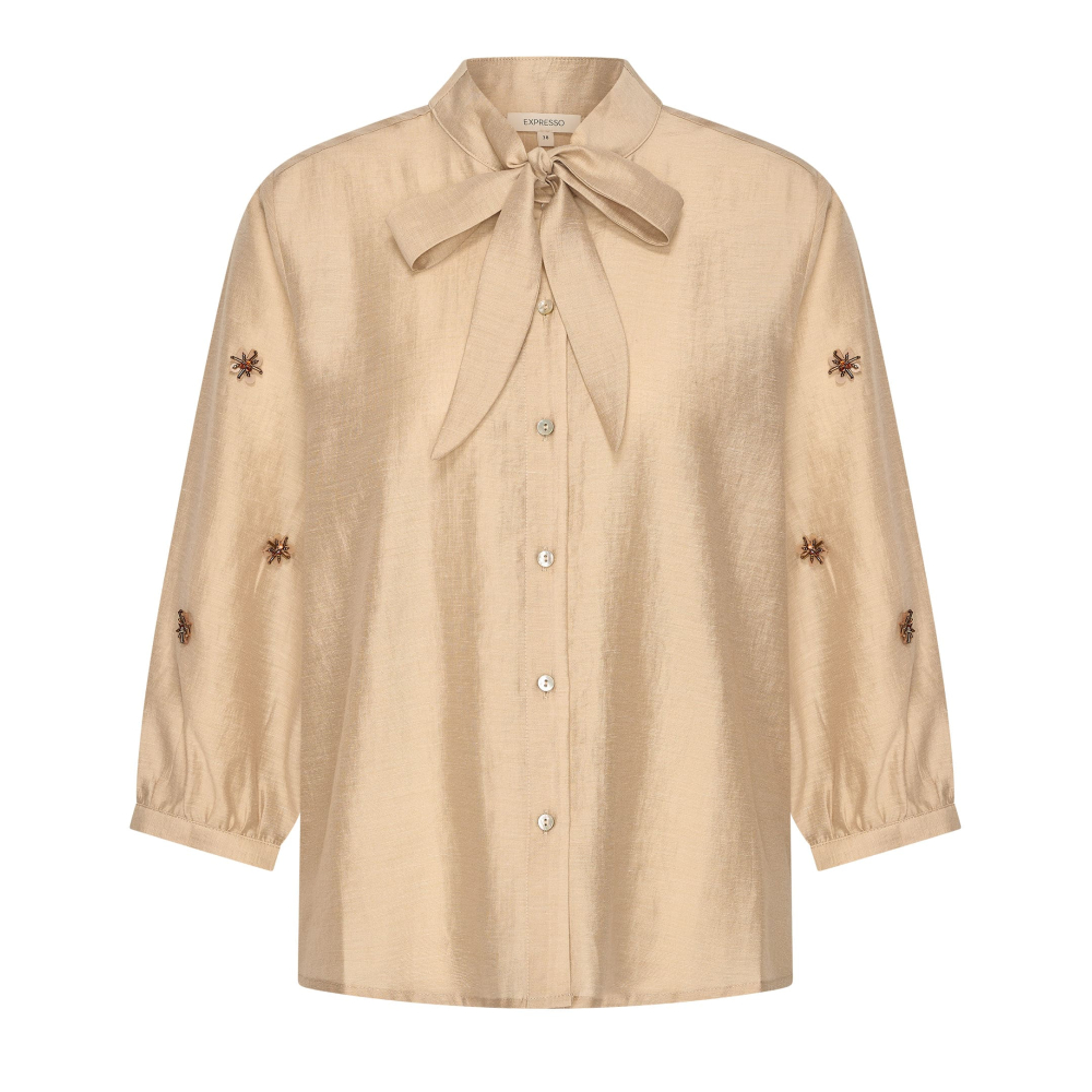 Elegante blouse van Expresso met een strikdetail in een luchtige, licht transparante kwaliteit met verfijnde details. Deze vrouwelijke blouse is uitgevoerd met een elegante strik bij de hals en mouwen met een zachte plooiing. De subtiele borduursels op de mouwen geven het ontwerp een ambachtelijke, luxe uitstraling, terwijl de soepele stof comfortabel draagt en mooi valt.