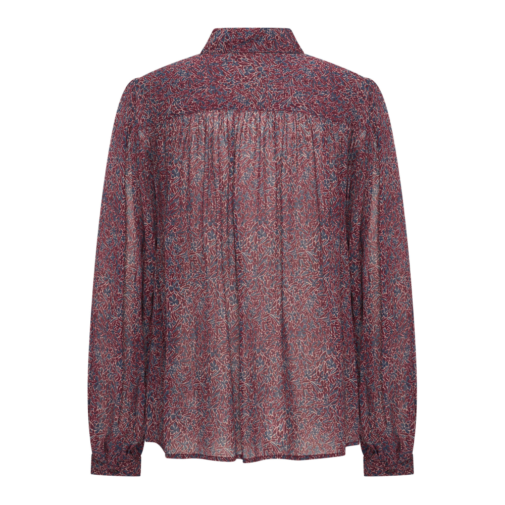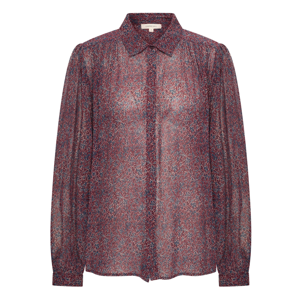 Luchtige semi-transparante blouse van Expresso met een abstract dessin. De subtiele glans geeft het blouse een verfijnde, luxueuze uitstraling. Dit losvallende model heeft een klassieke kraag en verborgen knoopsluiting. Perfect voor zowel zakelijke als casual looks.