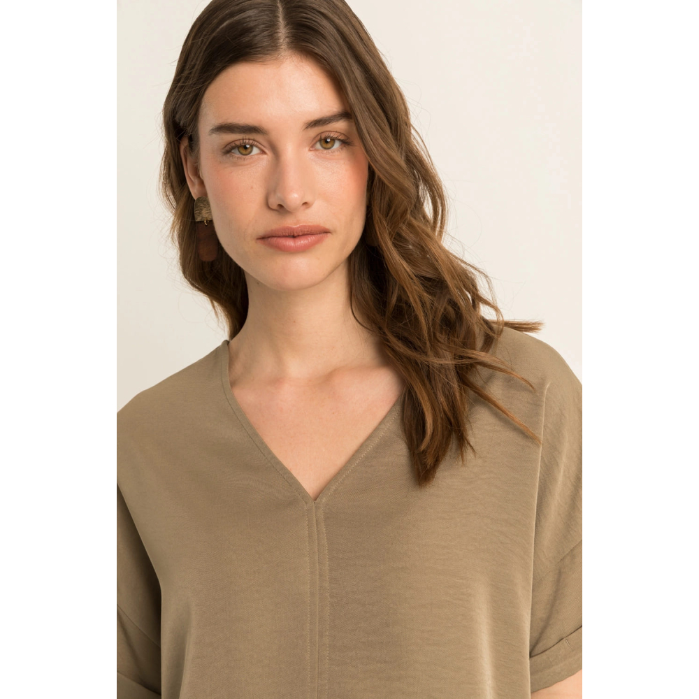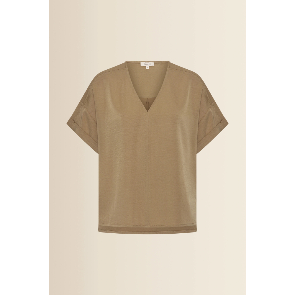 Elegante blouse top van Expresso in een soepelvallende kwaliteit met een verfijnde, licht glanzende uitstraling. Een relaxte en rechtvallende top met een V-hals en korte mouwen met omslag. Een stijlvol item dat elke look direct een verfijnde touch geeft.