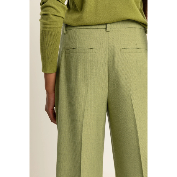 De broek heeft een hoge taille, steekzakken en scherpe vouwen aan de voorzijde die de lengte extra benadrukken.