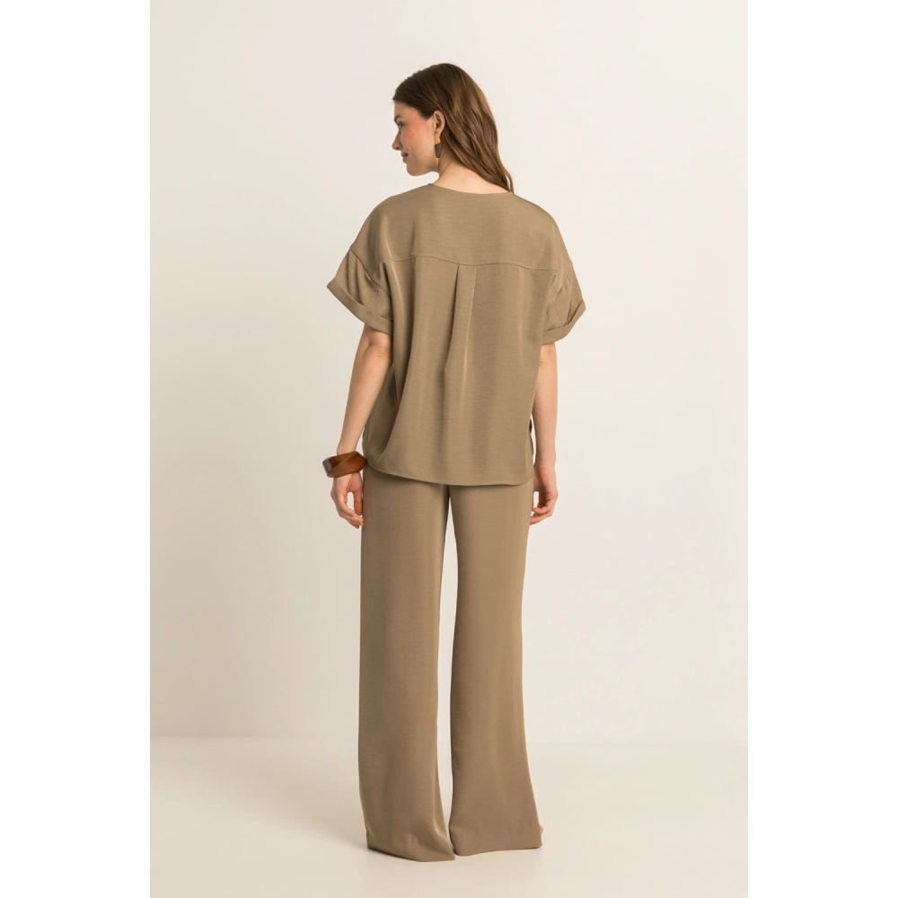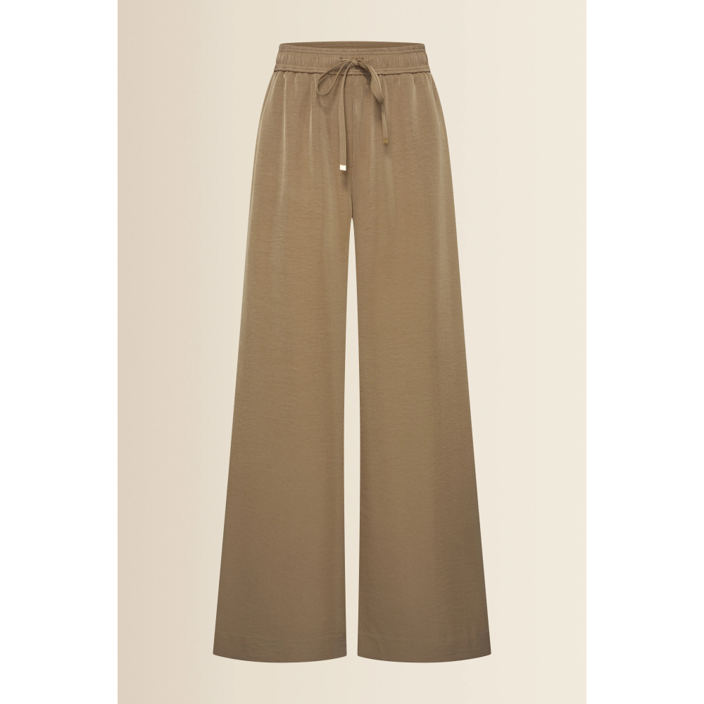 Expresso broek in een soepelvallende kwaliteit met een subtiele glans en een luchtige, elegante uitstraling. Hoog in de taille en relaxed vallend, met een elastische tailleband, strikceintuur en extra wijde pijpen. De lichte stof beweegt mooi mee en zorgt voor een comfortabele fit, terwijl de cleane afwerking deze broek een moderne, verfijnde look geeft. Een stijlvol item dat moeiteloos combineert, van casual chic tot gekleder moment.