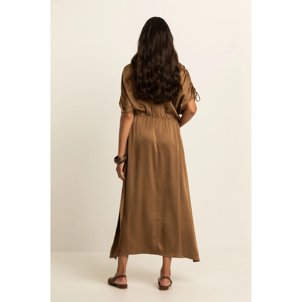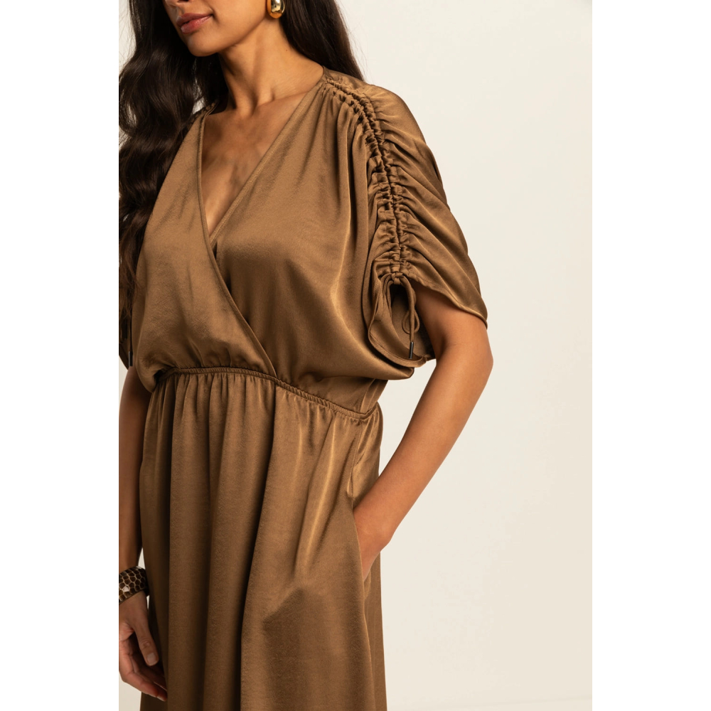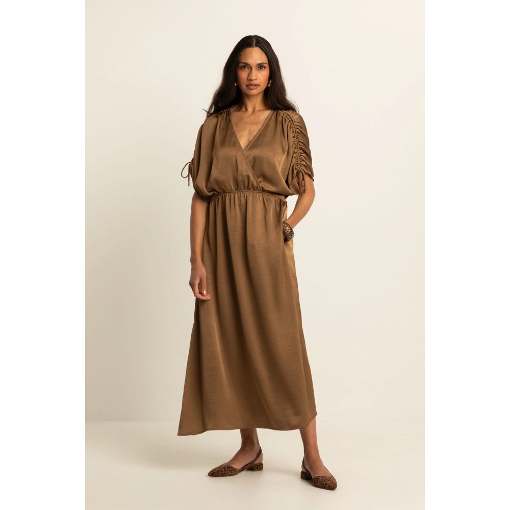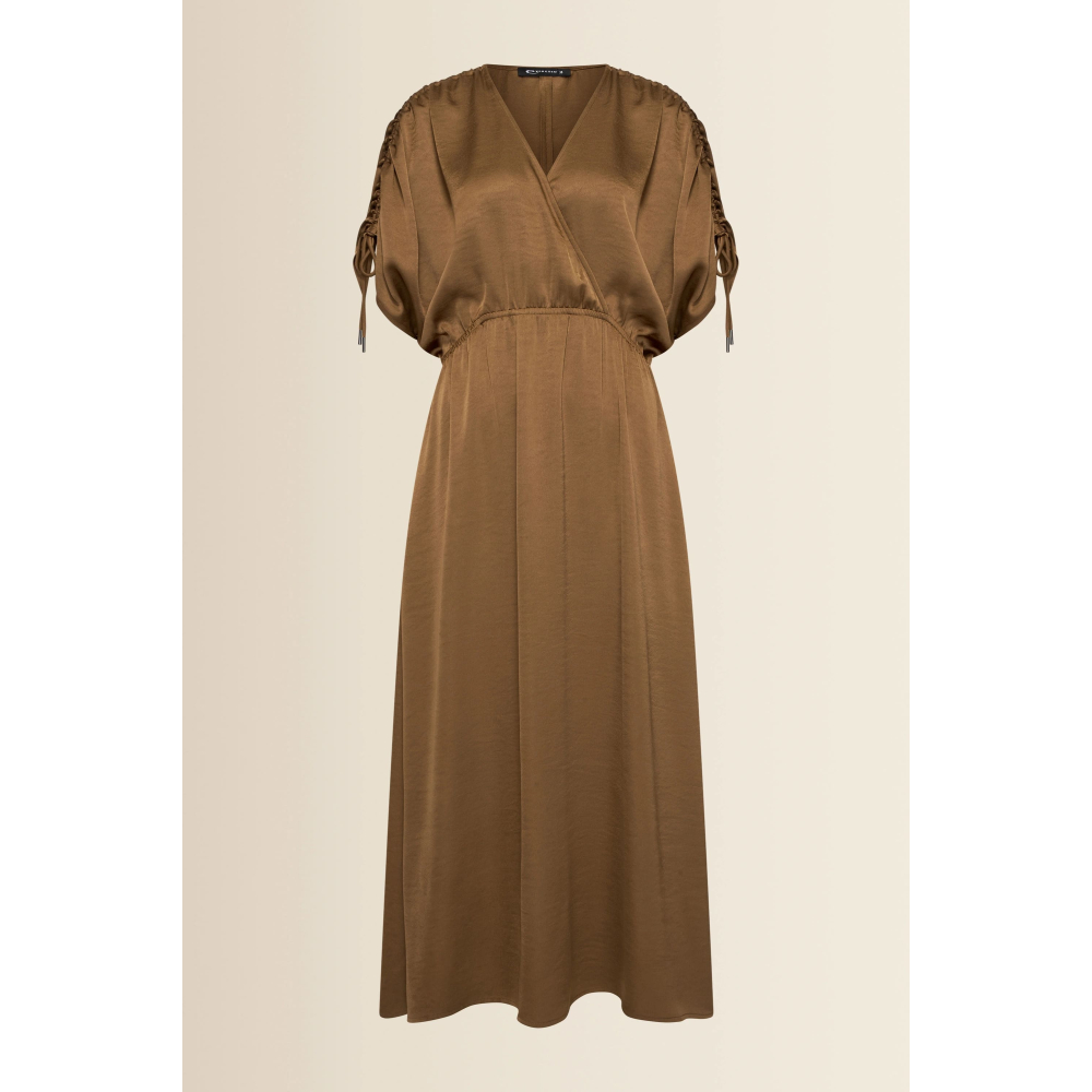 Midi jurk van Expresso in een soepelvallende satijnlook met een zachte glans. Vrouwelijk en elegant, met een overslag V-hals en een elastische taille die mooi vormt. De korte mouwen hebben een ruchedetail met striksluiting.