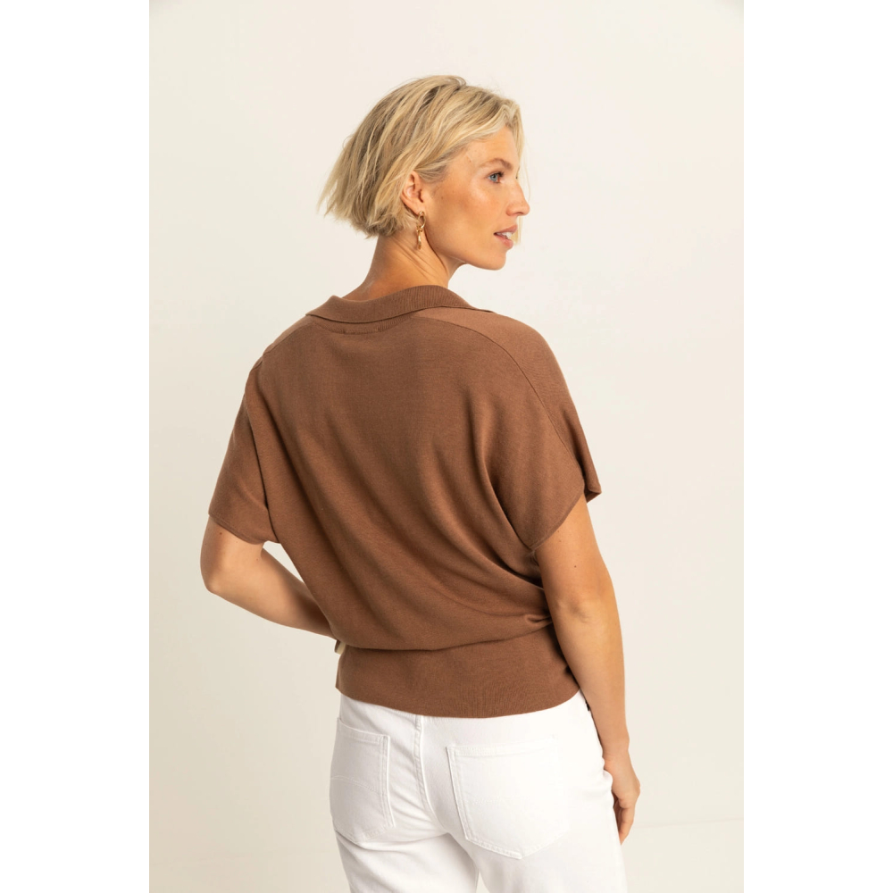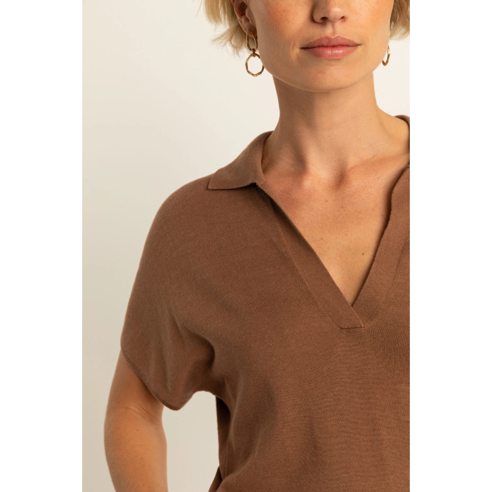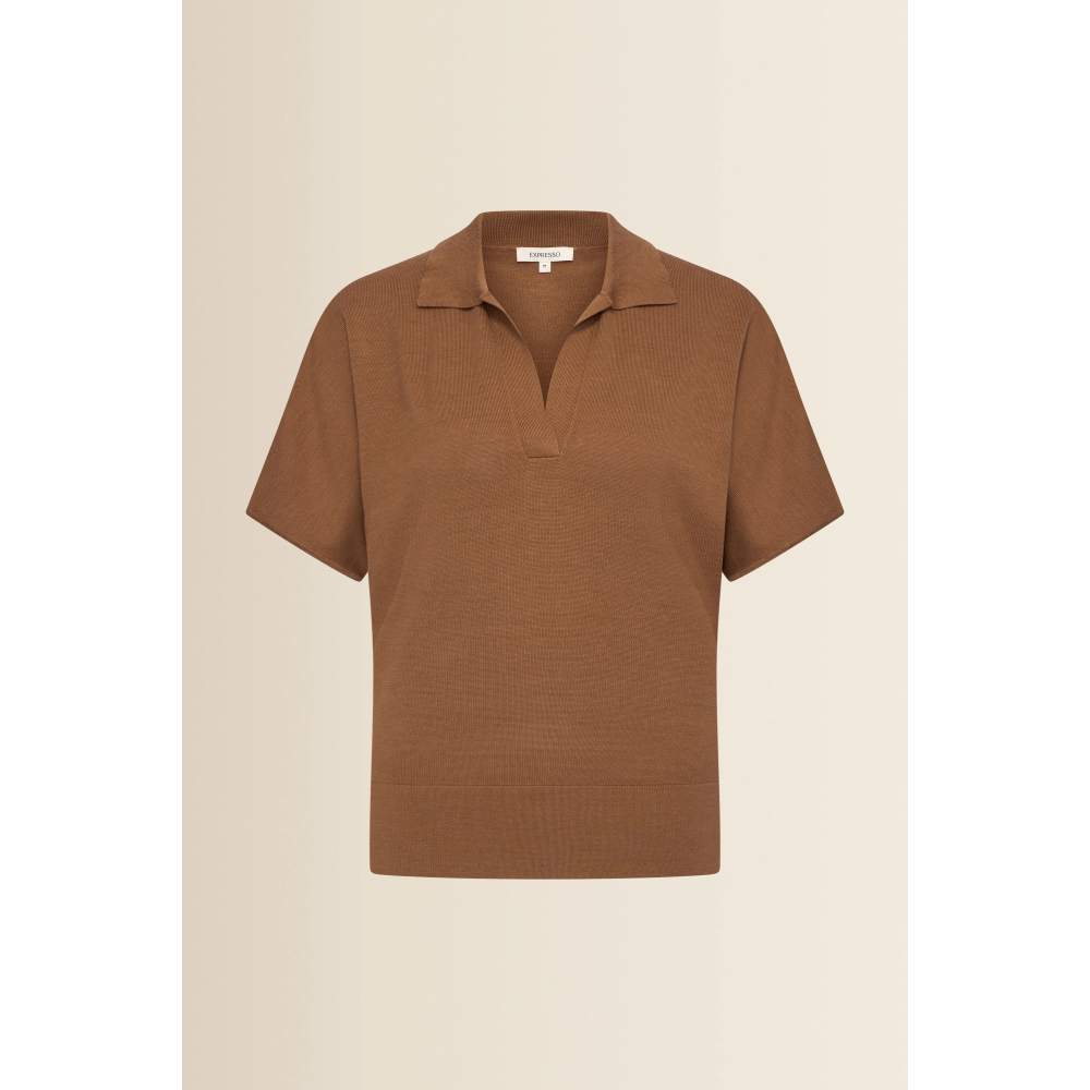 Zachte, fijngebreide polo van Expresso met een subtiele structuur. Relaxed & licht bloezend, met een klassieke kraag en V-hals. De korte mouwen en brede ribboord geven een effortless, verzorgde look.