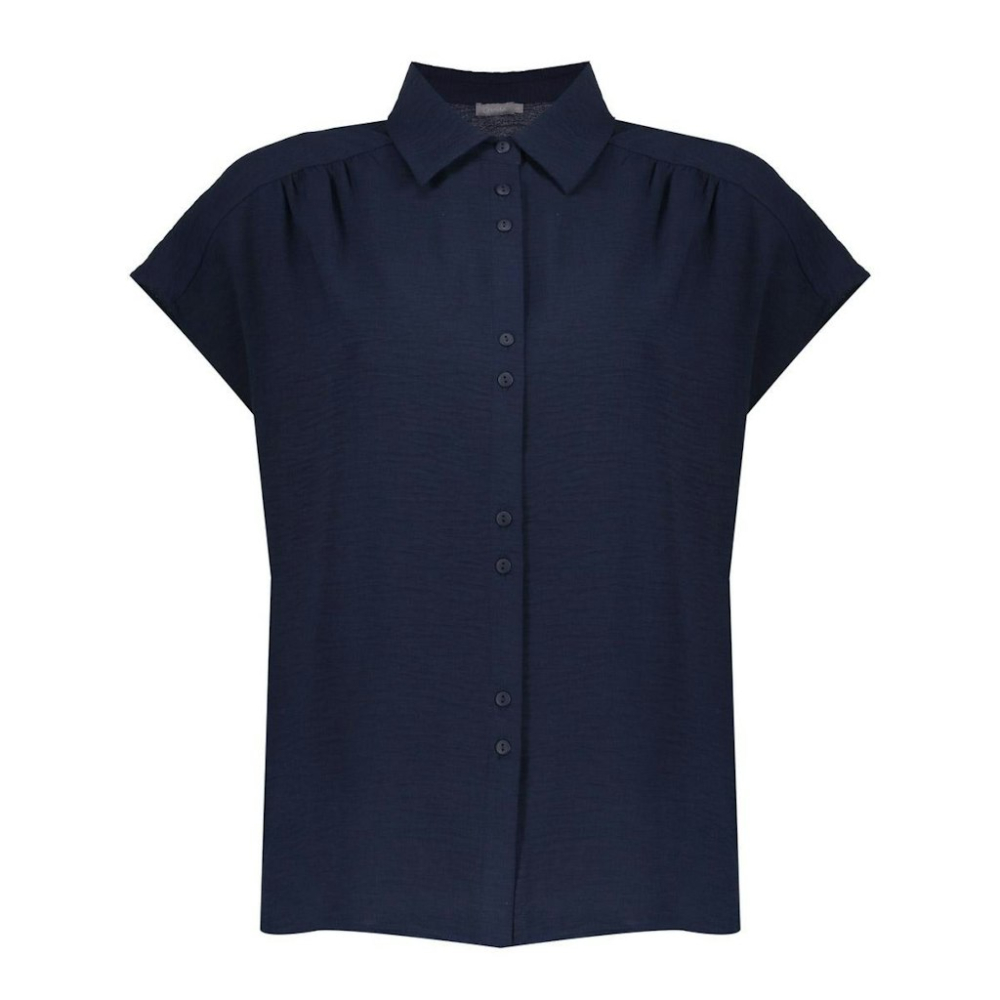 Deze luchtige Geisha blouse heeft bij de schouders een subtiele aangerimpeld plooieffect. Het heeft een klassieke kraag en een aangeknipte korte mouw. Draag de blouse ton-sur-ton of met een jeans voor een sportieve look.