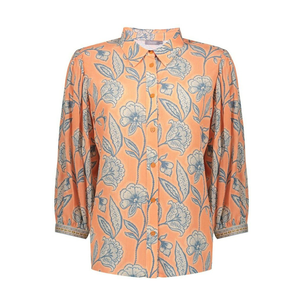 Prachtige blouse van Geisha met een verfijnd botanisch bloemendessin. De decoratieve manchetten en klassieke kraag zorgen voor een elegante finishing touch. Gemaakt van 98% viscose en 2% lurex Kleur : Coral Chambray Ecru