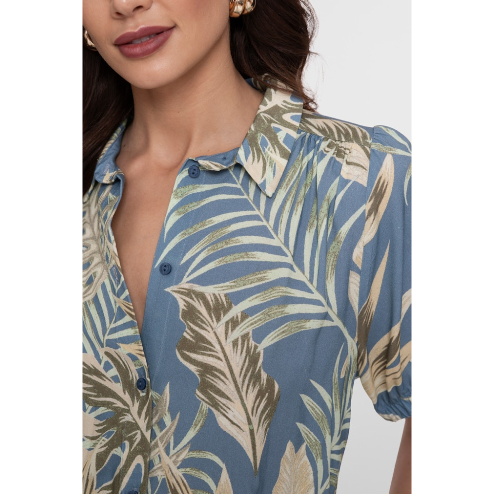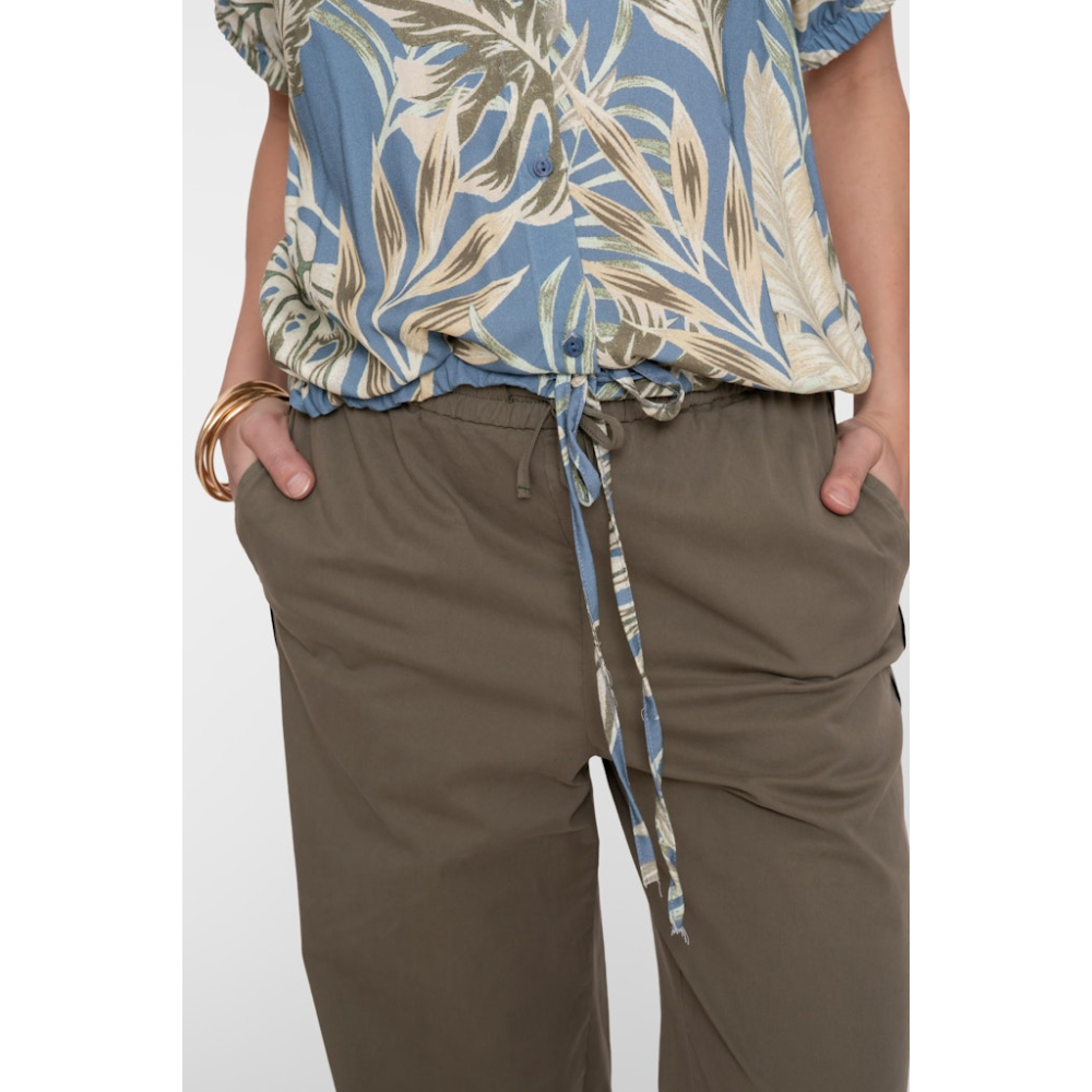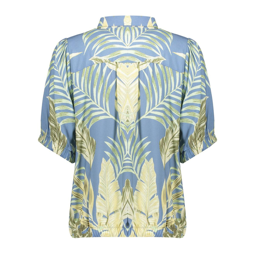 Prachtige blouse van Geisha met een klassieke kraag en een bladprint. Deze blouse heeft elastische boorden en een tunnelkoordje in de taille voor een speels effect. Gemaakt van 100% viscose Kleur : Olive Chambray