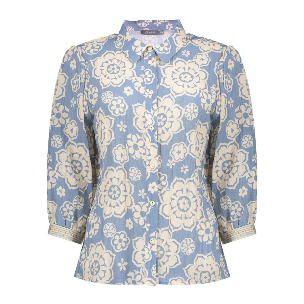 De zachte vergrote bloemenprint geeft deze Geisha blouse een elegante en vrouwelijke uitstraling. Het losvallende model zorgt voor een comfortabele pasvorm, terwijl de subtiele pofmouwen een verfijnd accent toevoegen. De klassieke kraag en doorknoopsluiting maken het geheel tijdloos en makkelijk te combineren.