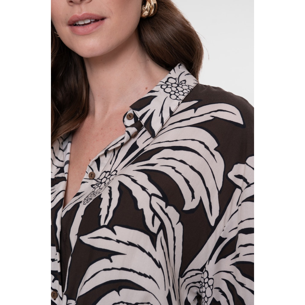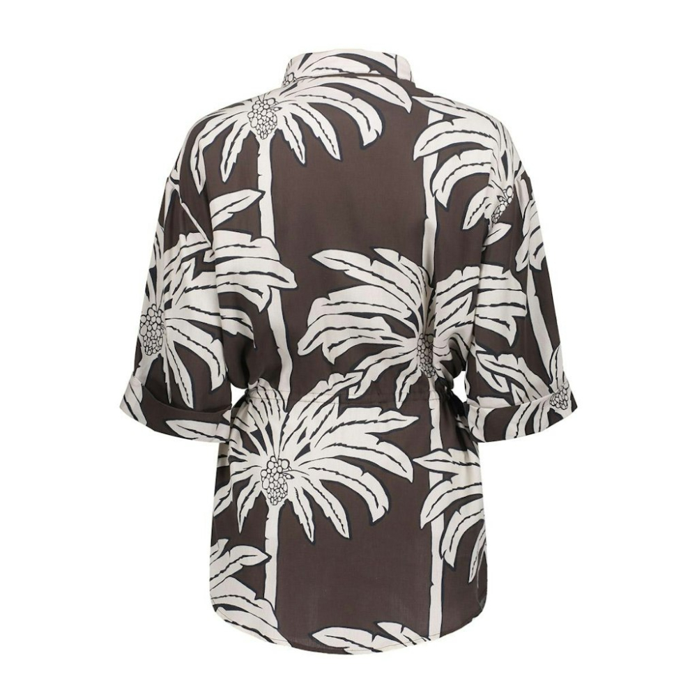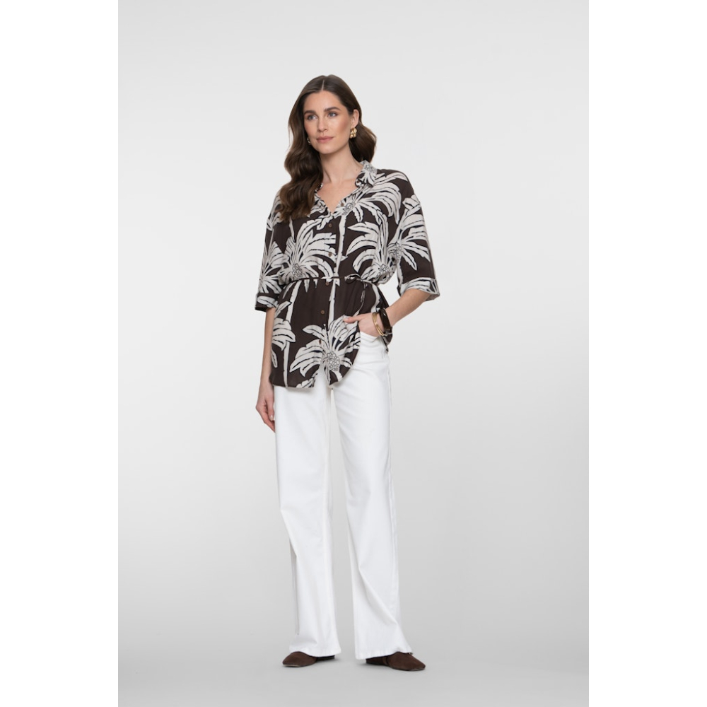 Deze prachtige blouse van Geisha heeft een palmprint in warme bruintinten. De klassieke kraag en volledige knoopsluiting geven een tijdloze uitstraling, terwijl de 3/4 losvallende mouwen zorgen voor een nonchalante touch. Met de strikceintuur accentueer je subtiel de taille en creëer je een vrouwelijk silhouet.