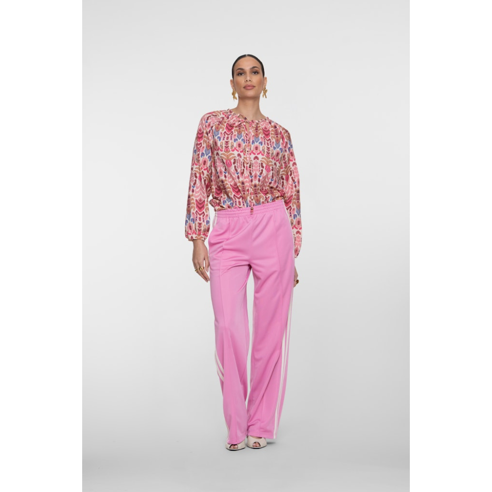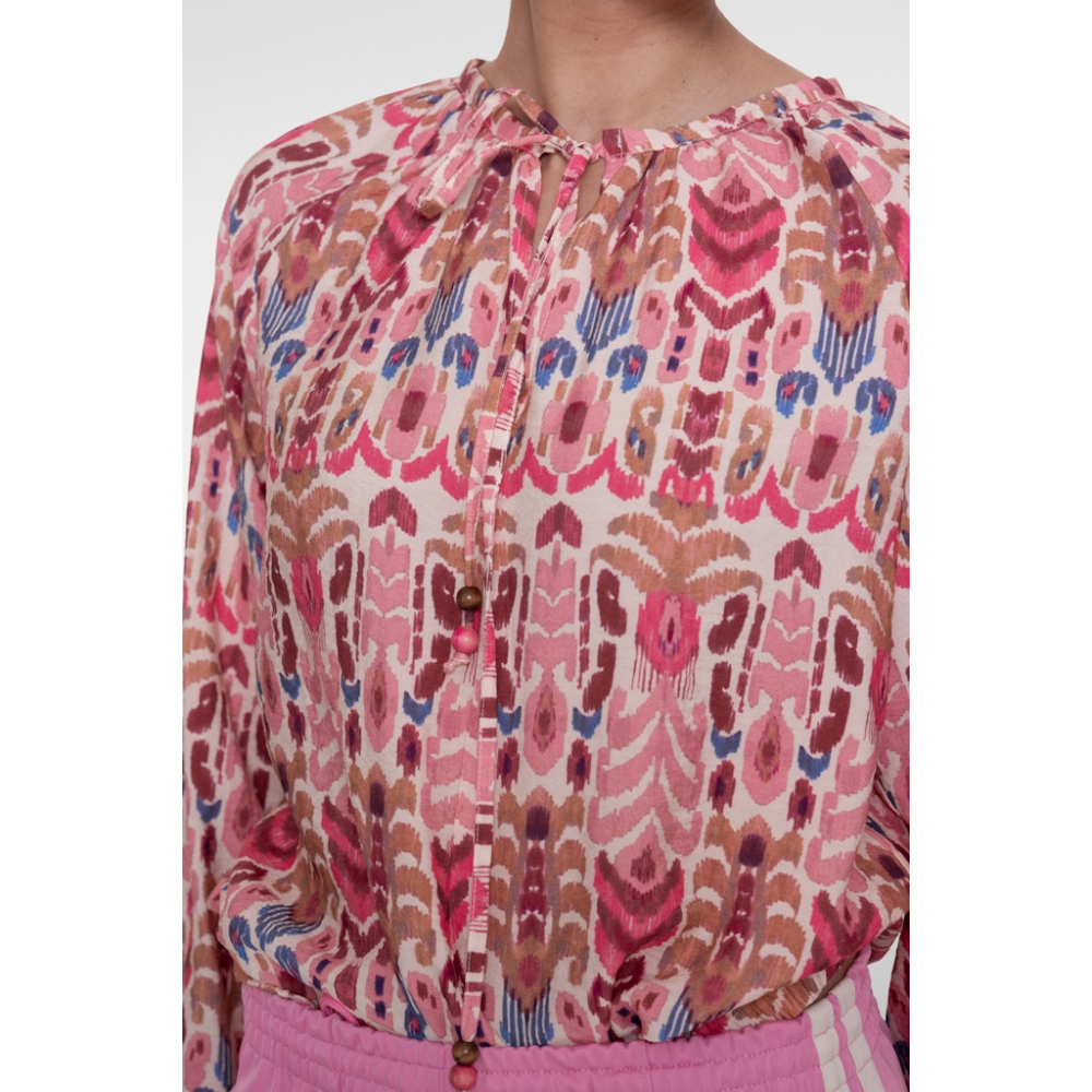 Deze blouse top van Geisha is een speelse mix van zachte pastel strepen en gedrukte embroidery in frisse neonaccenten. De ronde hals met strikkoord en opvallende kwastjes geeft een vrolijke touch, terwijl sierknopen en elastische cuffs zorgen voor een subtiel detail.