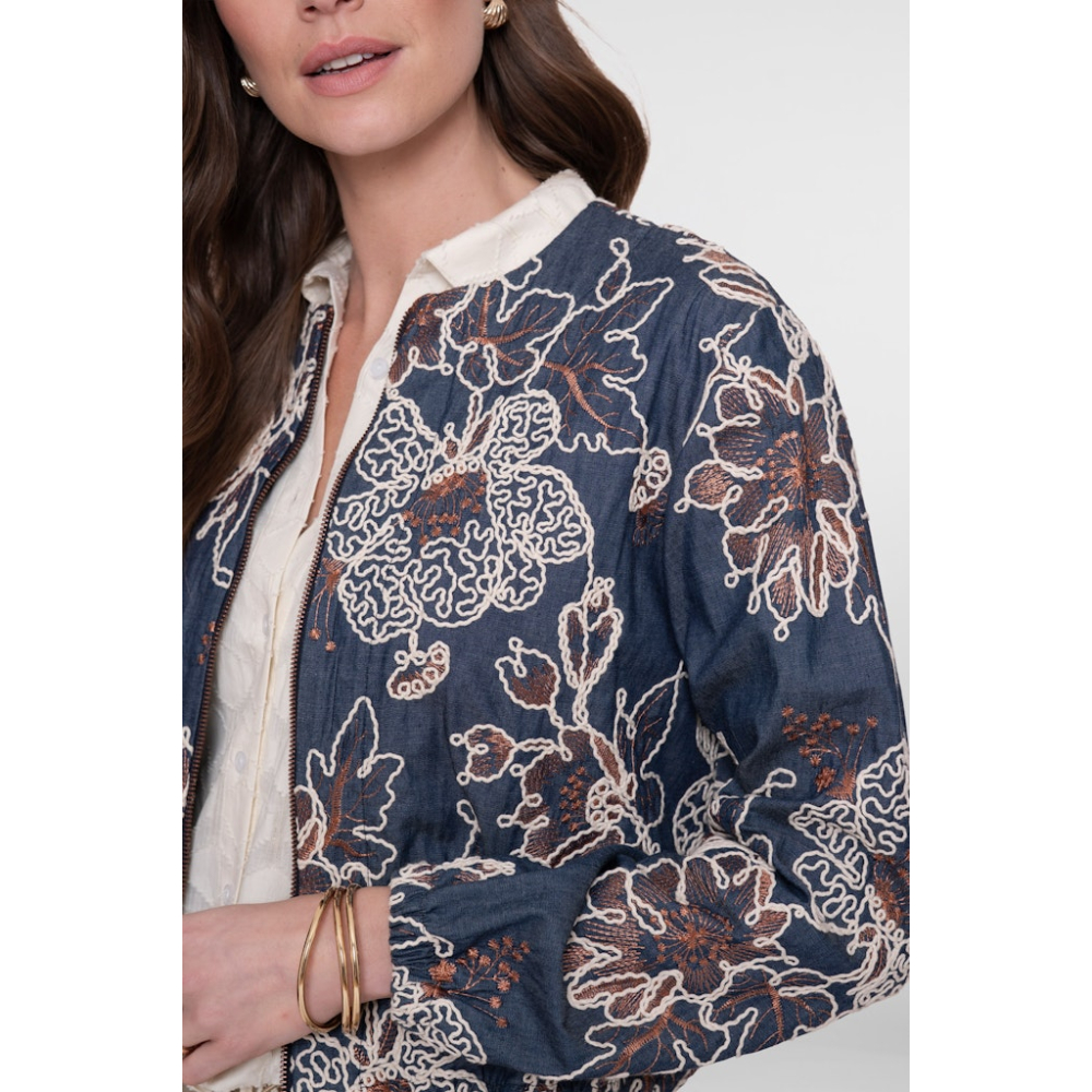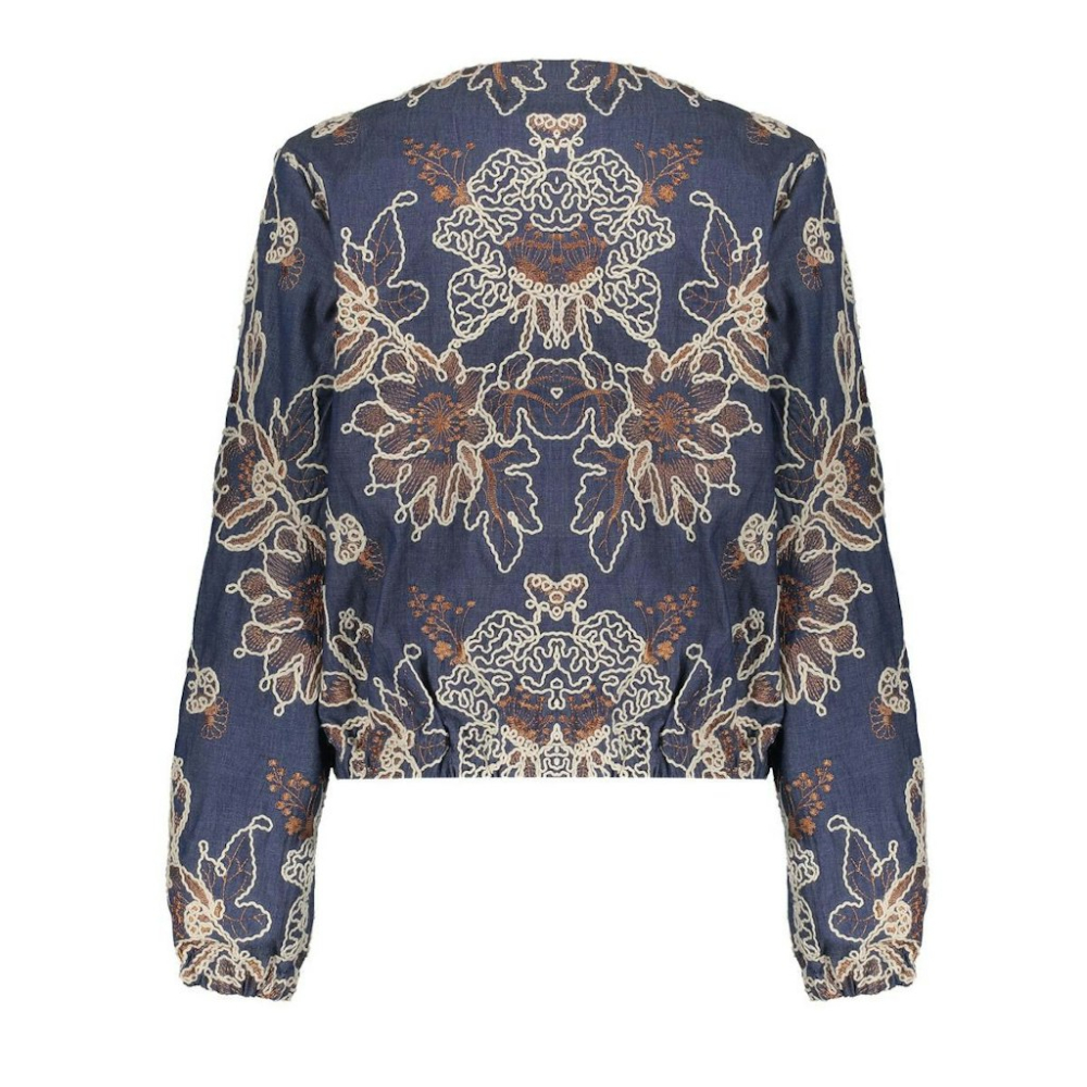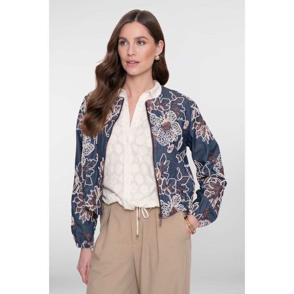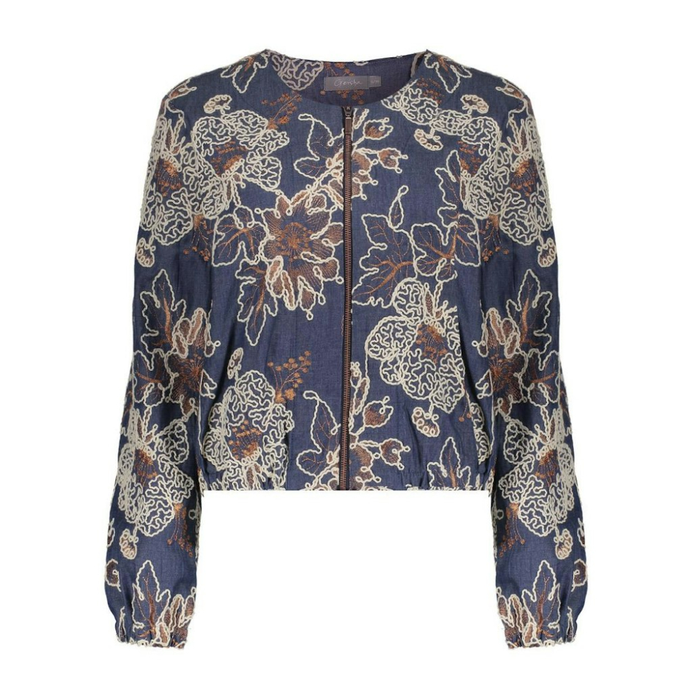 Dit jasje van Geisha heeft geborduurde contrasterende details die het dessin tot leven brengen en diepte geven aan de look. De rechte pasvorm valt soepel om het lichaam en het denim materiaal zorgt voor een stoere basis. De elastische cuffs creëren een subtiel volume in de mouwen. Perfect op een blouse of basic T-shirt.