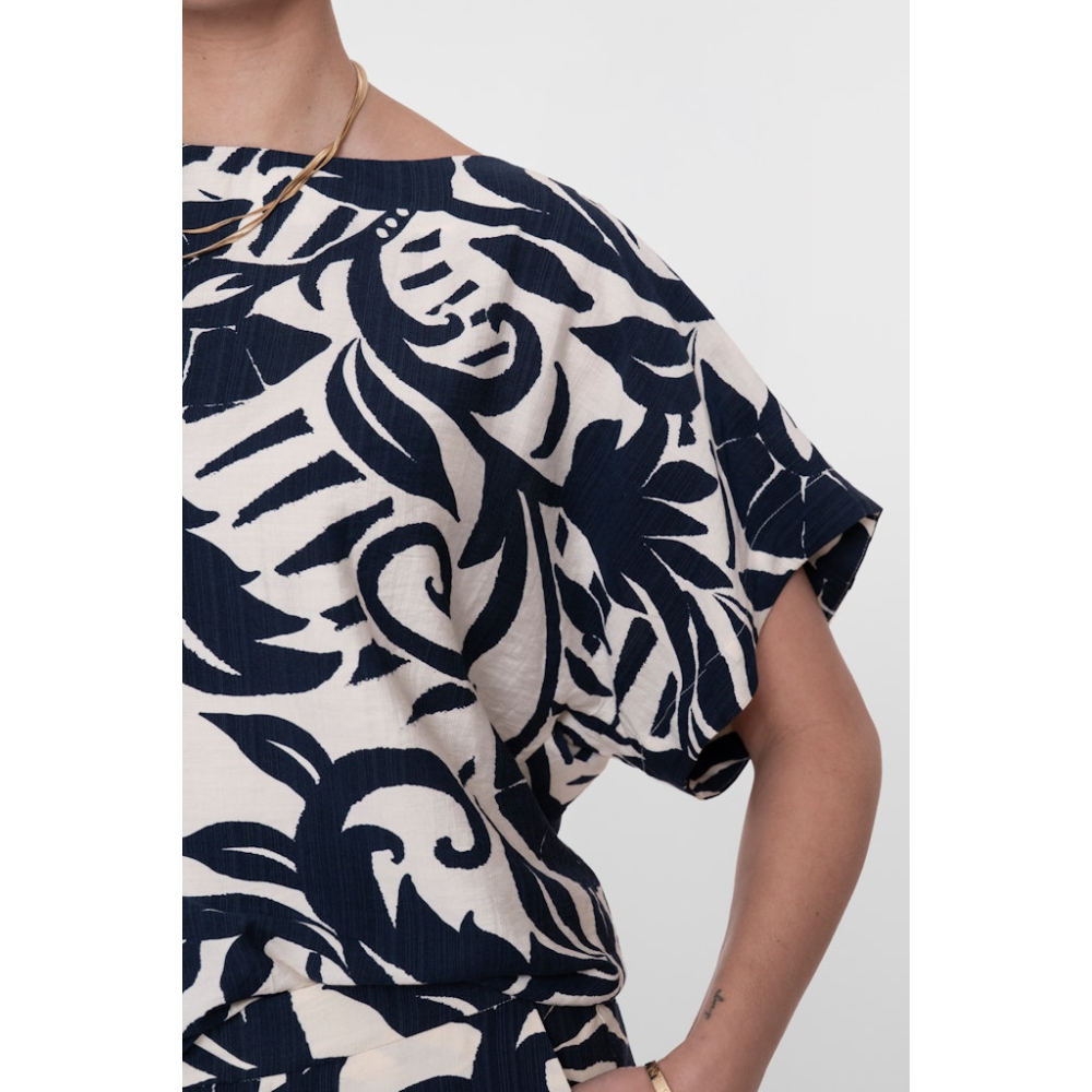 Stijlvolle Geisha top met een sierlijk bloemdessin. De ronde hals en de soepelvallende vlindermouwen geven het ontwerp een elegante uitstraling. Het losvallende model draagt comfortabel en vormt samen met de bijpassende broek een sterke co-ord look, maar de top combineert net zo mooi met een lichte jeans of pantalon.