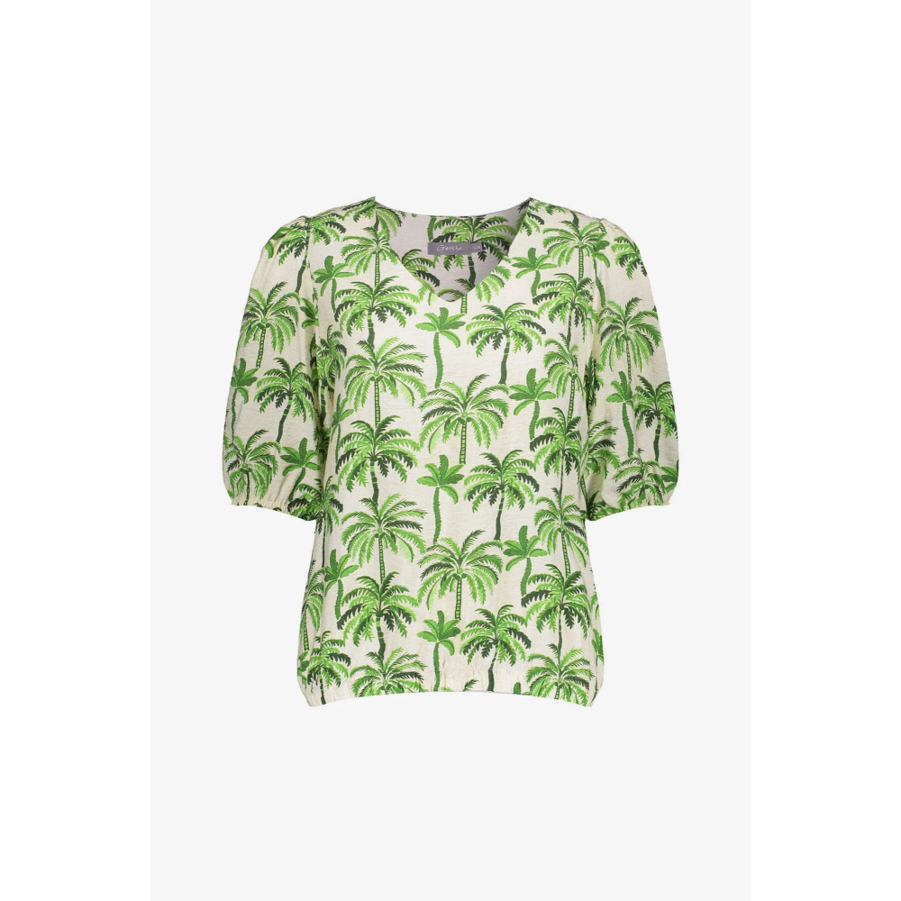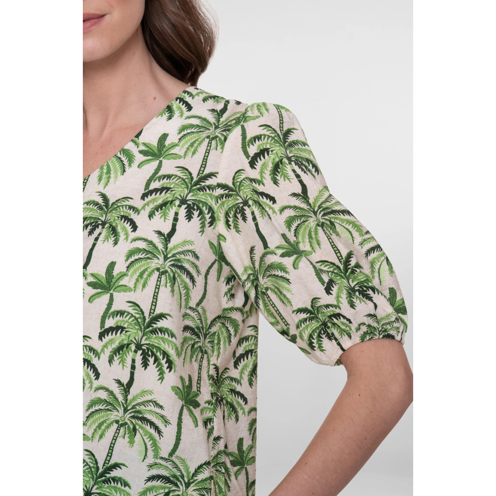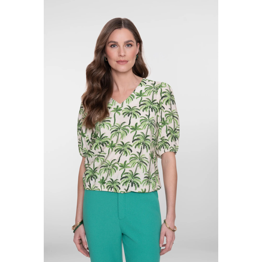 Deze Geisha top is een frisse eyecatcher met zomerse allure. De V-hals en subtiele driekwart pofmouwen geven een vrouwelijke touch, terwijl het rechtvallende model zorgt voor een comfortabele fit. Dankzij het elastiek in de mouwen en taille krijgt de top een speels silhouet. De tropische palm print brengt direct een stijlvolle, tropische vibe.