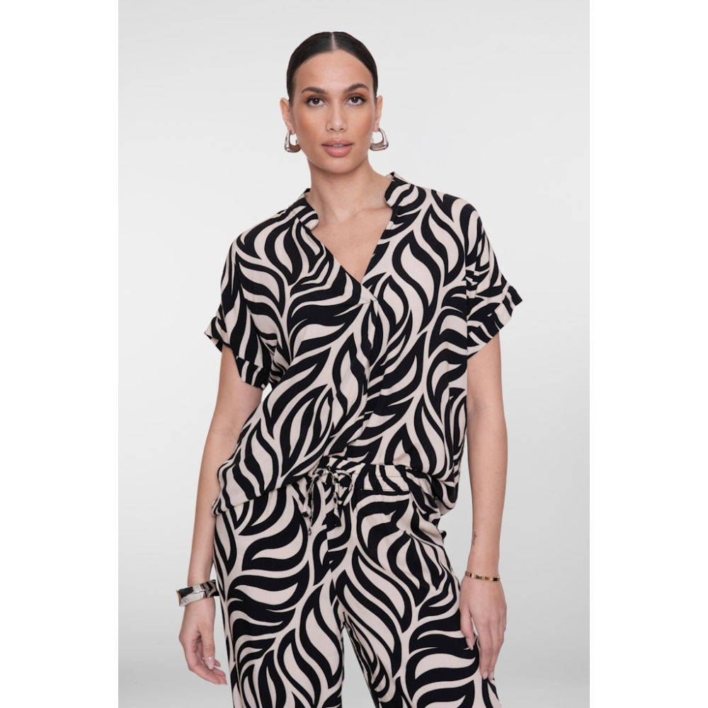 Stijlvolle top van Geisha met een swirl dessin. De rechte, losse pasvorm en losvallende korte mouwen zorgen voor een nonchalante twist. Het heeft een opstaande boord met V-snit. Een veelzijdig item die zowel casual gedragen kan worden als een meer gestylde avondlook.