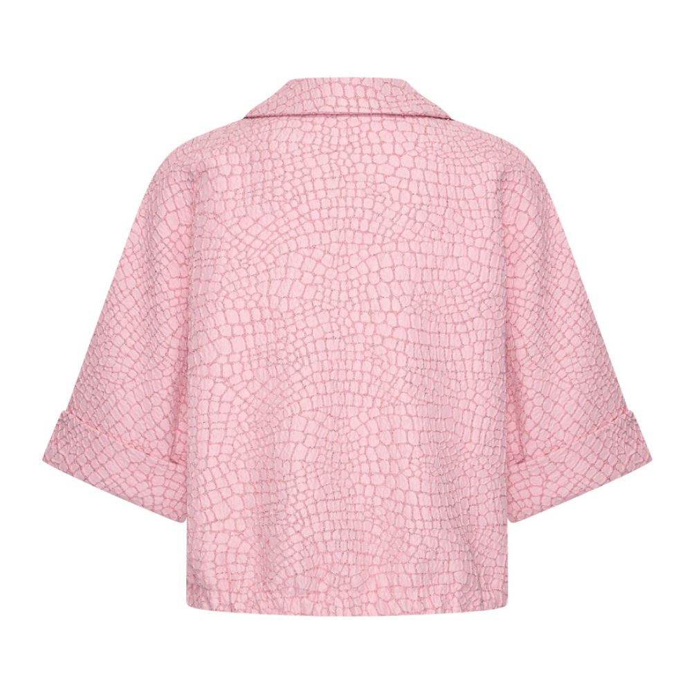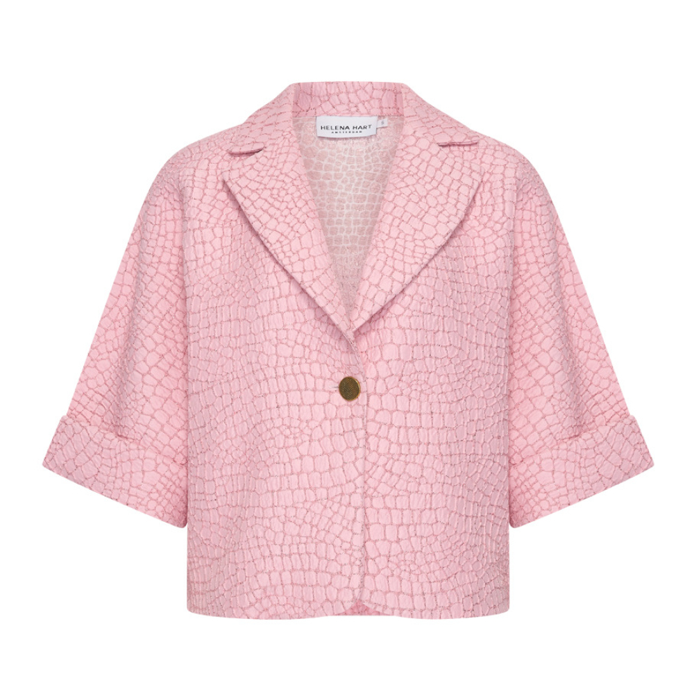 Een korter jasje van Helena Hart met een croco patroon en een leuk omslagje in de drie kwart mouw. Zowel voor nu als naar het voorjaar, is dit jasje met veel bomber details elk moment draagbaar.
