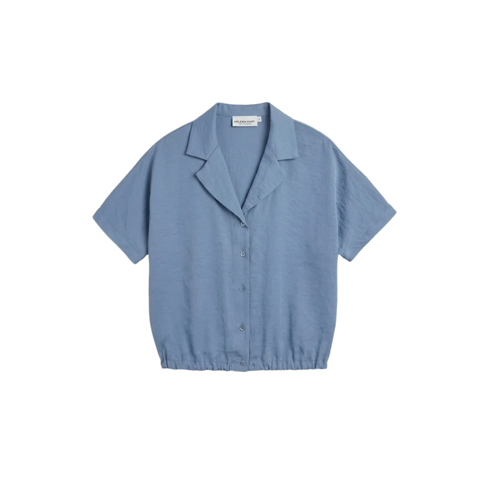 Een fijne, losvallende blouse van Helena Hart met een lichte glans. De blouse heeft een V-hals, korte mouwen en een rij knoopjes. Daarnaast heeft de blouse een trekkoord aan de onderkant, zodat de blouse zowel los als gepoft gedragen kan worden.