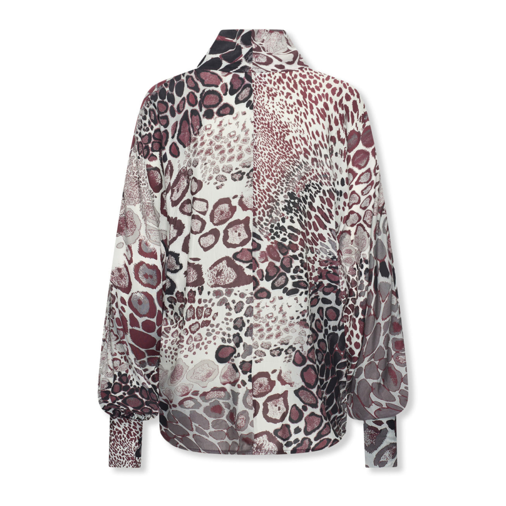 Prachtige blouse van Helena Hart met een animal print, halsstrik en wijdvallende ballonmouwen.