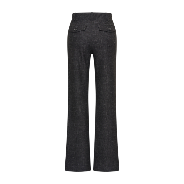 Deze broek met patroon is afgewerkt met fijne steekzakken, striklussen en paspelzakjes.