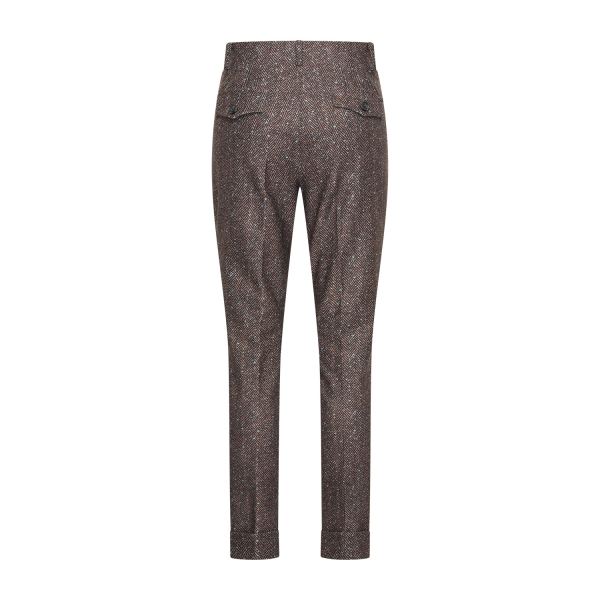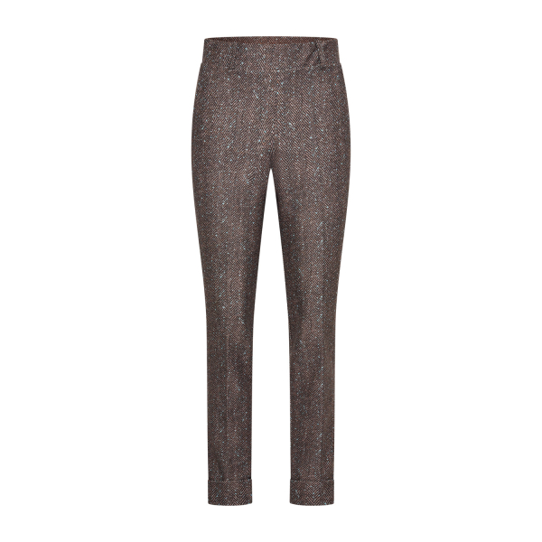 Deze broek in tweed look is afgewerkt met fijne steekzakken, riemlussen en paspelzakjes.