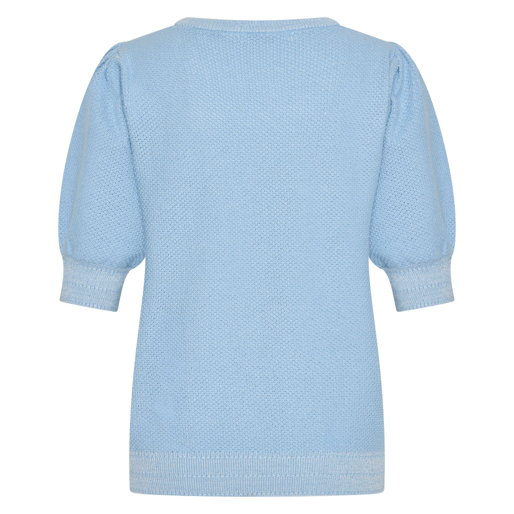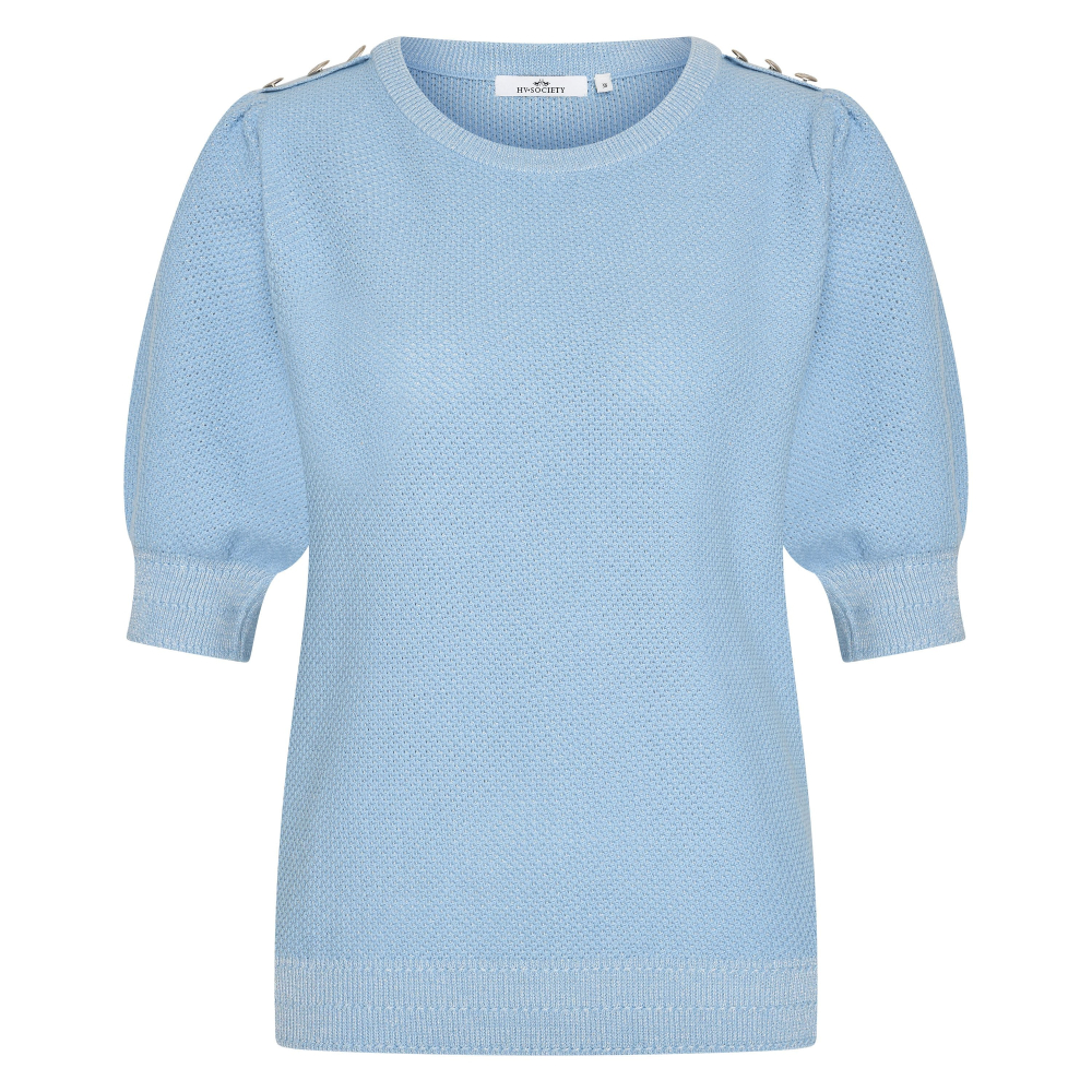 Heerlijke gestructureerde pullover van HV Society met een ronde hals en korte pofmouwtjes. De lurex zorgt voor een sprankelend effect en de knopendetails op schouders maken dit truitje helemaal af.