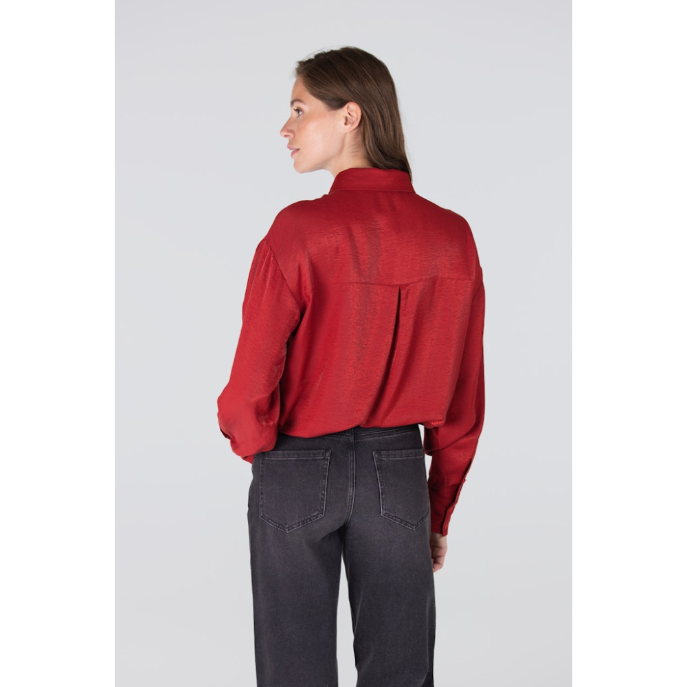 Deze elegante oversized blouse van Jansen Amsterdam oogt moeiteloos chic door de luxe glanzende stof. De blousekraag en blinde sluiting zorgen voor een cleane, verfijnde look. Met lange mouwen, manchetten met knoopjes, en een afgeronde zoom biedt deze blouse zowel comfort als flair. Perfect om te combineren met een pantalon of casual jeans.