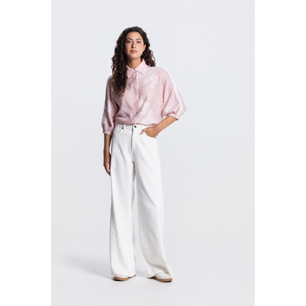 Prachtige blouse van Jansen Amsterdam met 3/4 mouwen en een subtiel dessin. De blouse heeft een elegant wit kantdetail op de mouwen, wat een speels en verfijnd accent toevoegt. Comfortabel, stijlvol en perfect voor een casual-chic look.