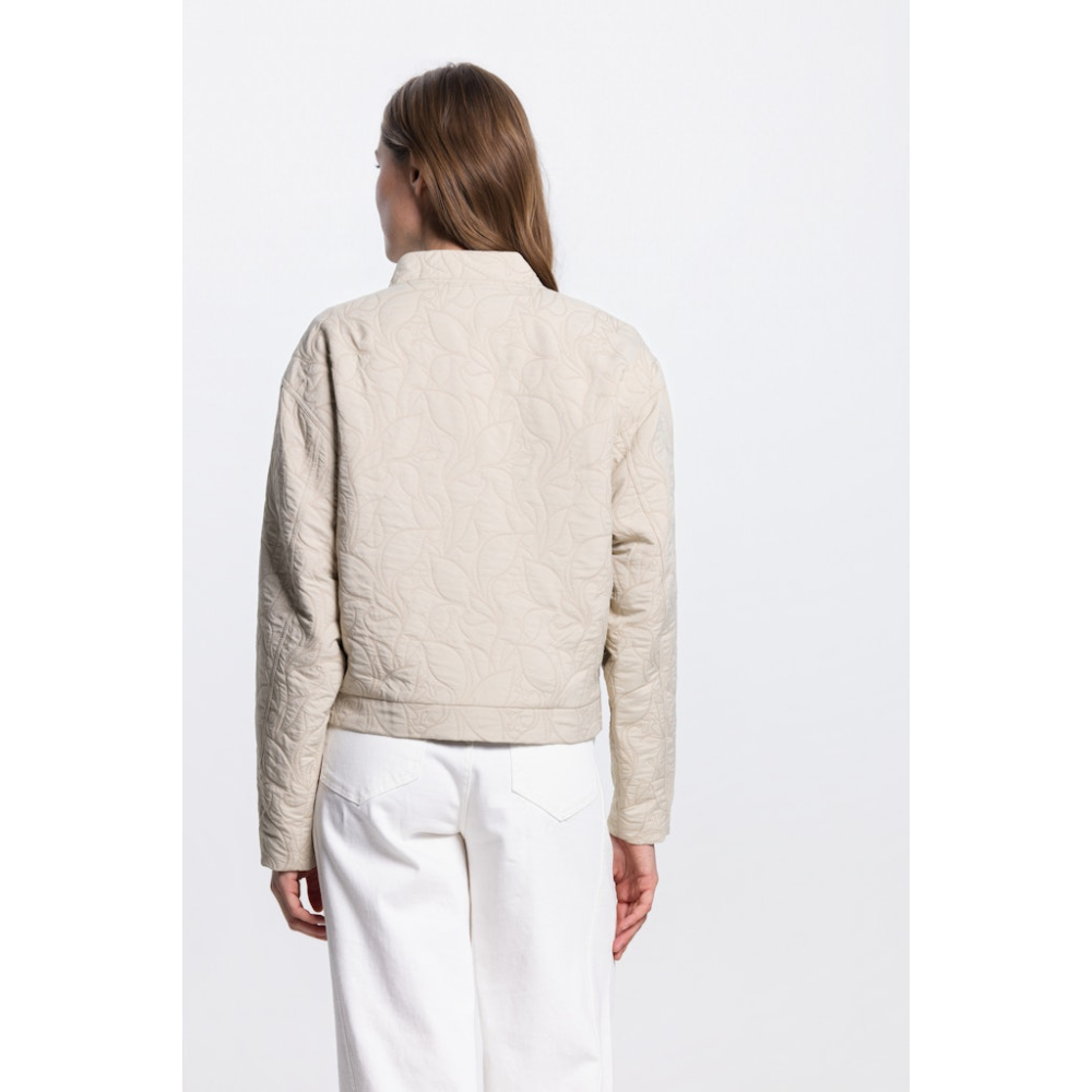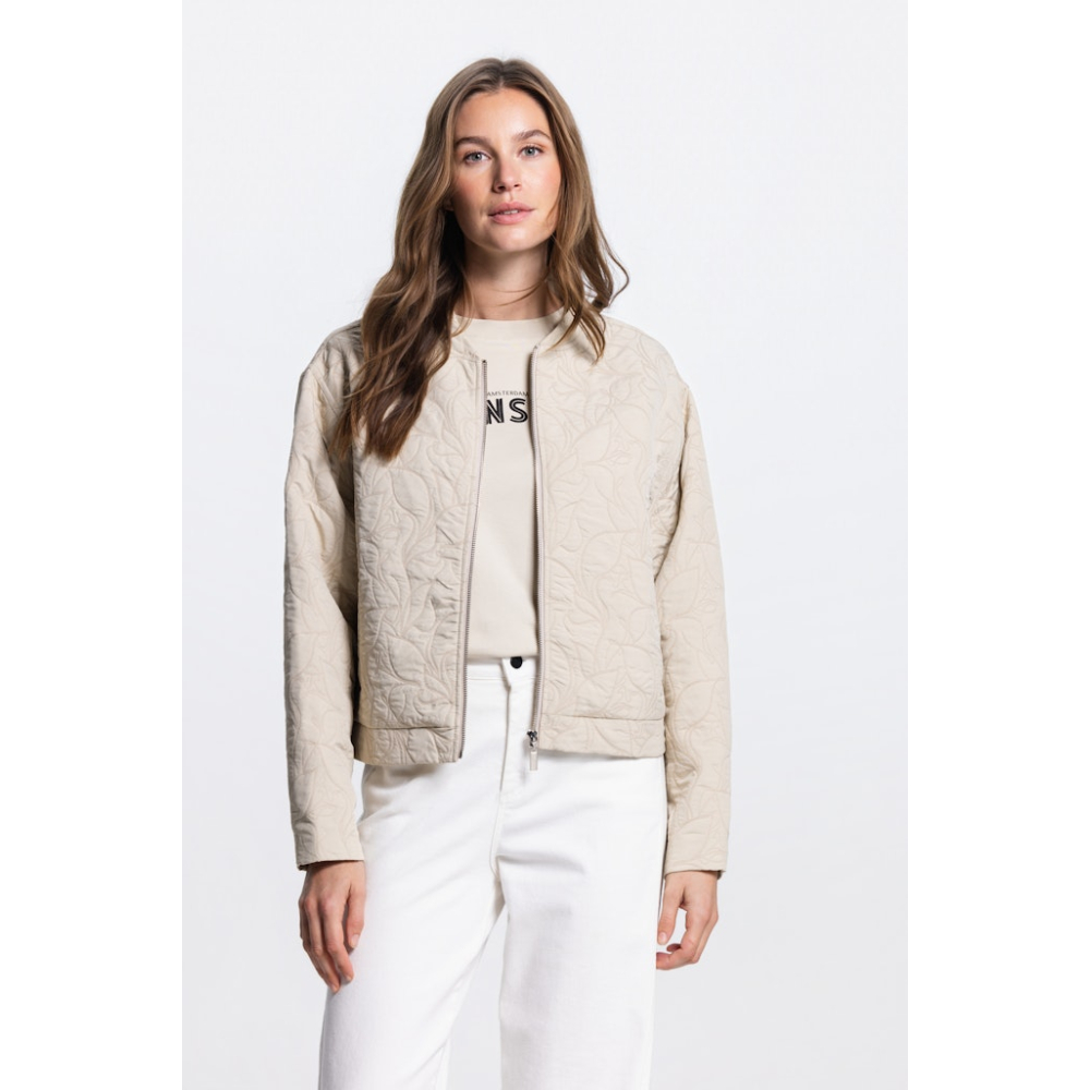 Dit moderne bomber jasje van Jansen Amsterdam heeft een elegante, rechtvallende look. Het jasje heeft een ritssluiting, insteekzakken en een subtiel ton-sur-ton ingestikt patroon voor een verfijnde, luxueuze uitstraling.