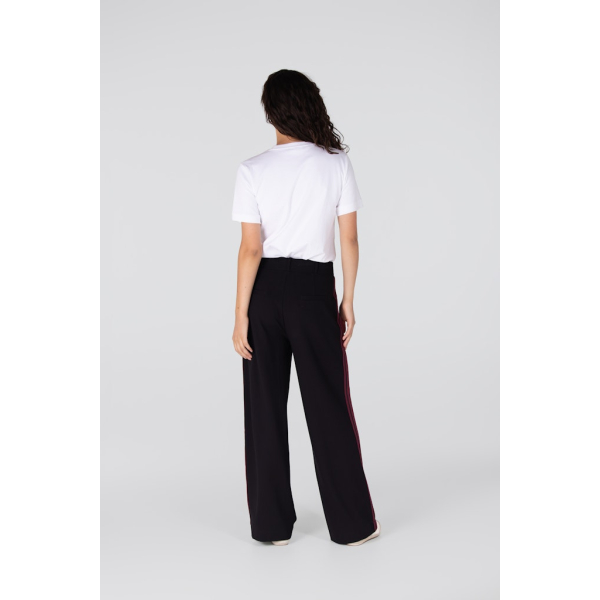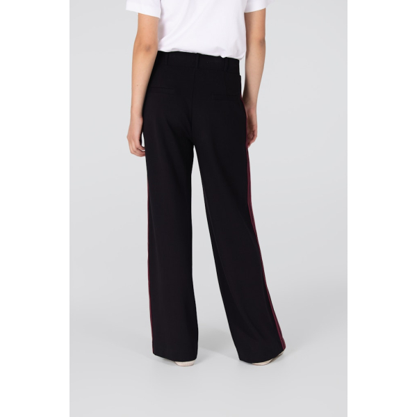 Deze broek is voorzien van een tailleband met riemlussen, steekzakken aan de voorkant en decoratieve strookzakken aan de achterzijde.