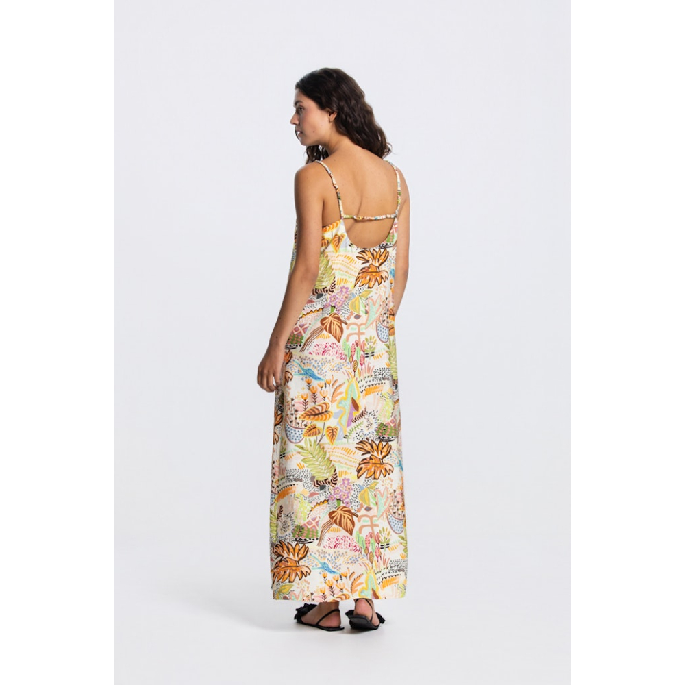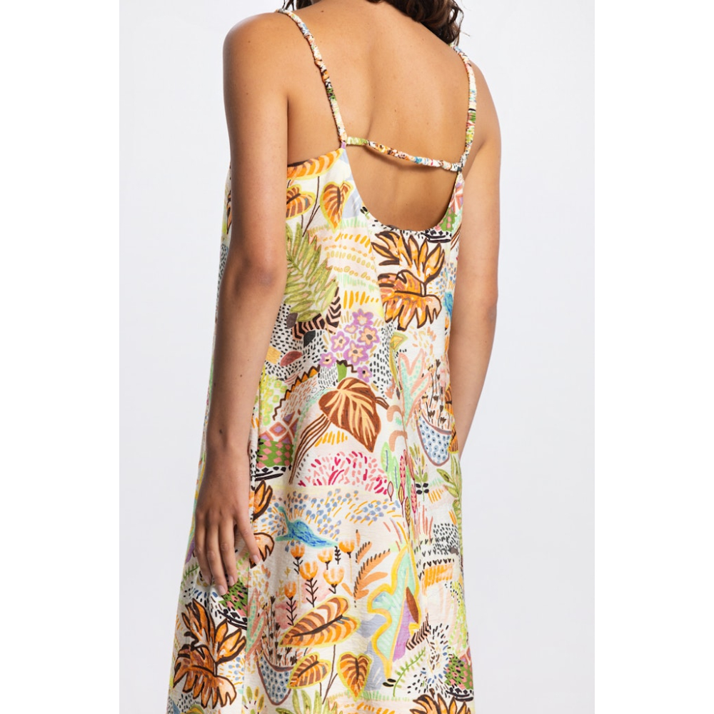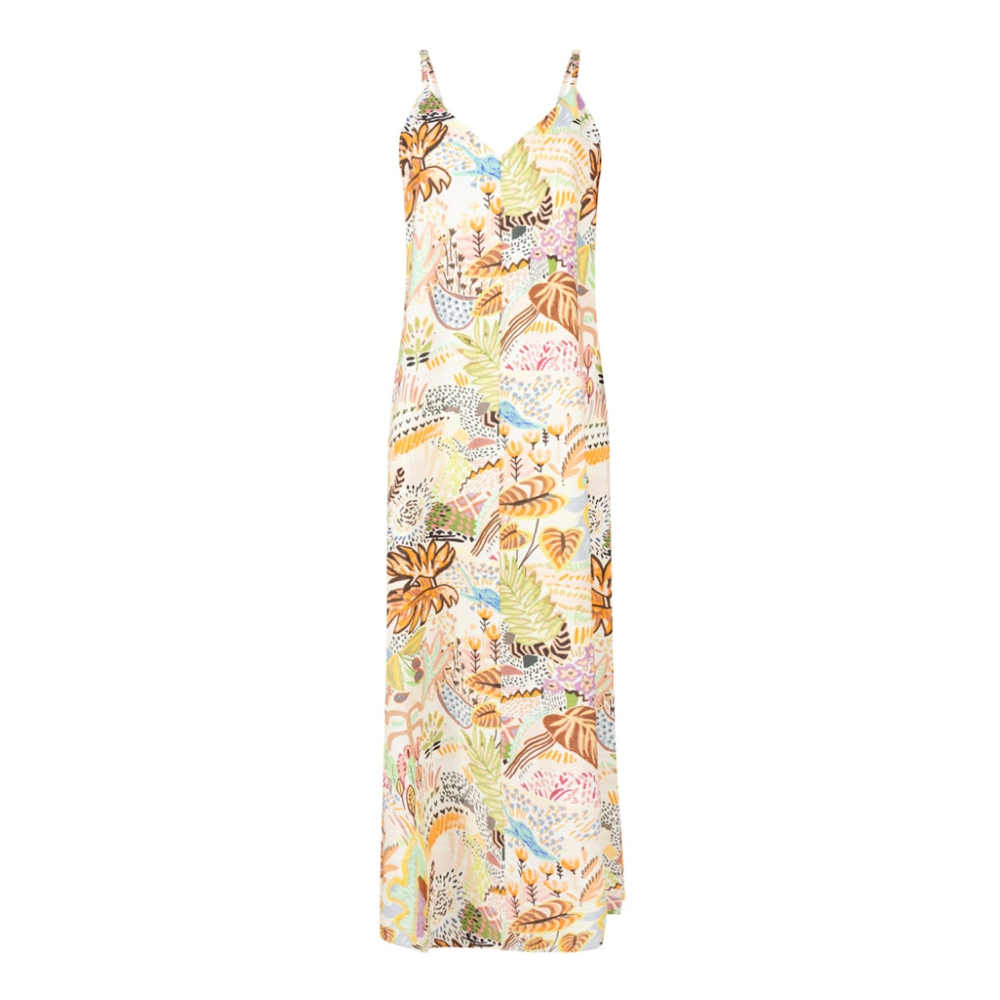 Elegante jurk van Jansen Amsterdam met elastische bandjes voor optimaal draagcomfort. De jurk heeft een subtiele V-hals en een all-over kleurrijk dessin, ideaal voor een elegante, casual-chic look.