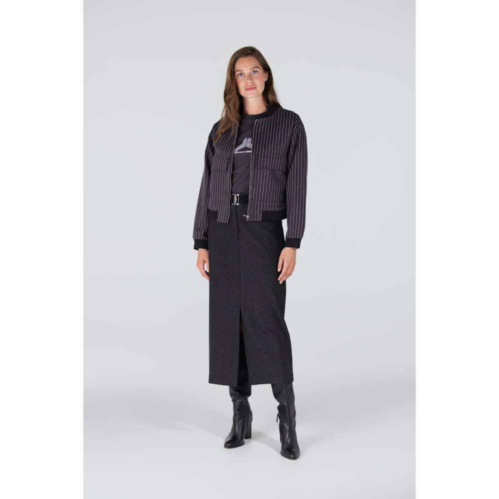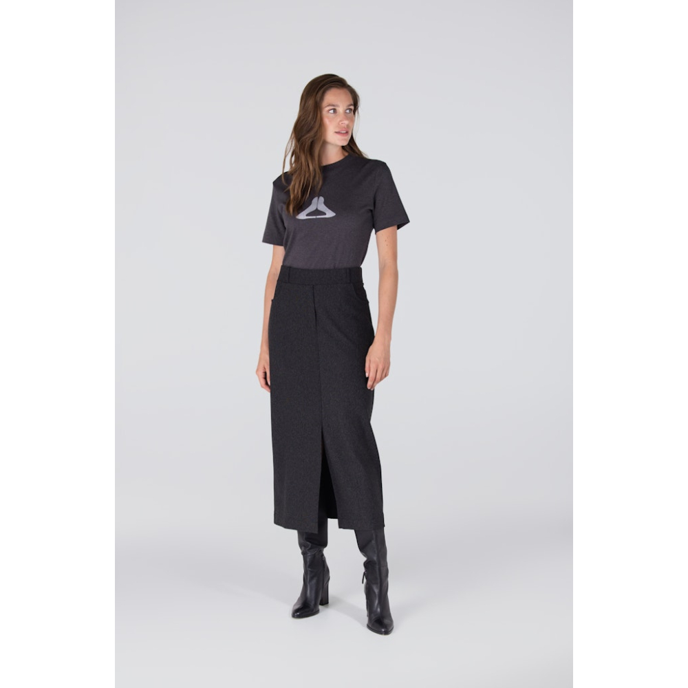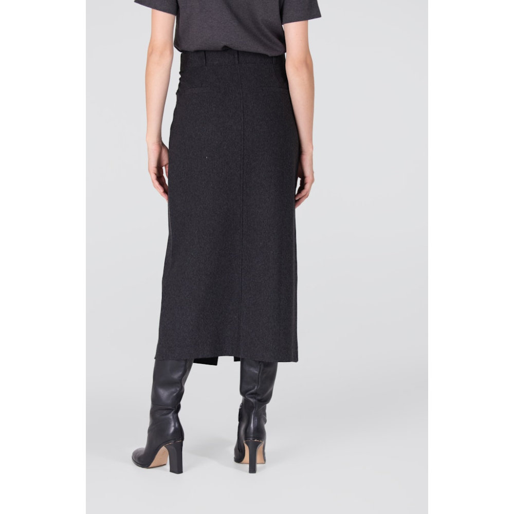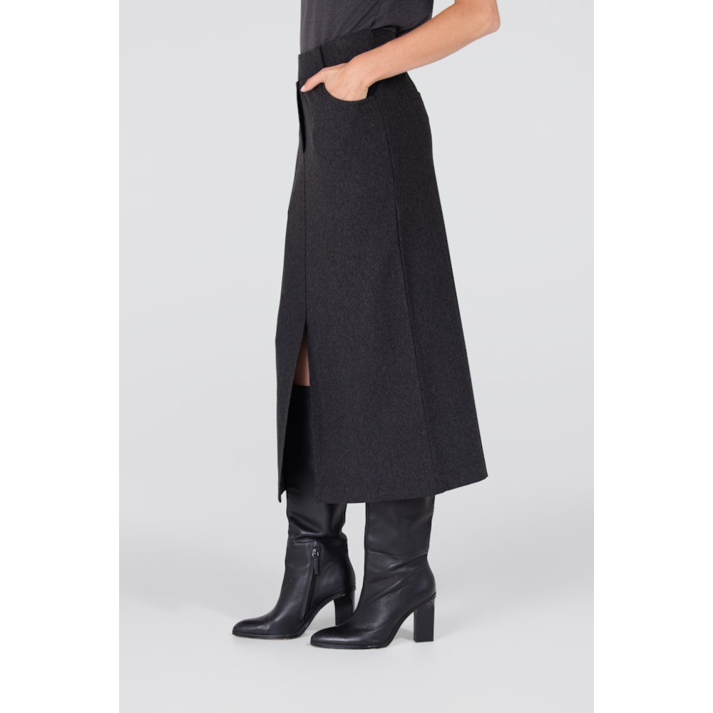 Een lange, elegante rok van Jansen Amsterdam met een moderne twist. De split middenvoor zorgt voor extra bewegingsvrijheid en een vrouwelijke touch. De rok is voorzien van een tailleband met riemlussen, praktische zakjes aan de voorkant en paspelzakken achter voor een stijlvolle afwerking.