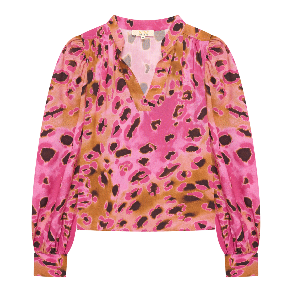 Prachtige blouse van Nia Nor met een V-halslijn en een kleurrijke print. Deze blouse heeft lange mouwen met manchetten en subtiele sierknopen in dezelfde print. Een stijlvolle blouse voor jouw garderobe!