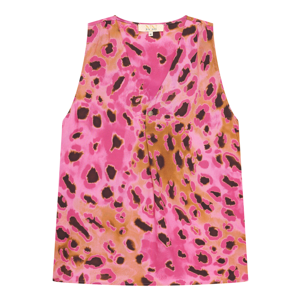 Prachtige mouwloze top van Nia Nor met een V-hals en een kleurrijke print. Deze luchtige top heeft goudkleurige sierknoop als sierlijk detail.