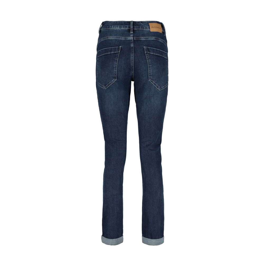 De broek heeft een subtiel borduursel op de steekzakken en een dubbele knoopssluiting.
