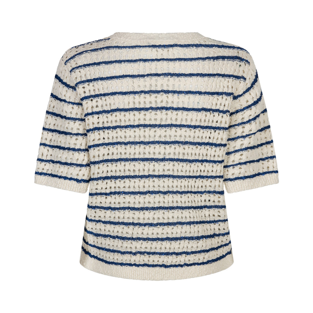 Een grof gebreide top van Red Button met een ronde hals en horizontale strepen. De top heeft geribde boorden en korte pofmouwen. Regular Fit Gemaakt van 85% katoen en 15% polyester Kleur : Jeans Blue