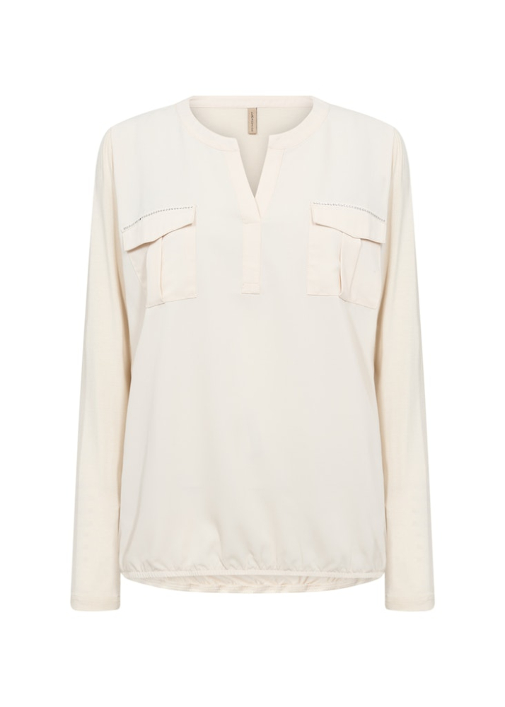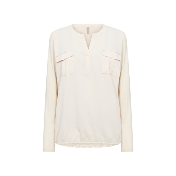 Deze effen blouse van Soyaconcept heeft een gespleten V-hals en twee borstzakken.