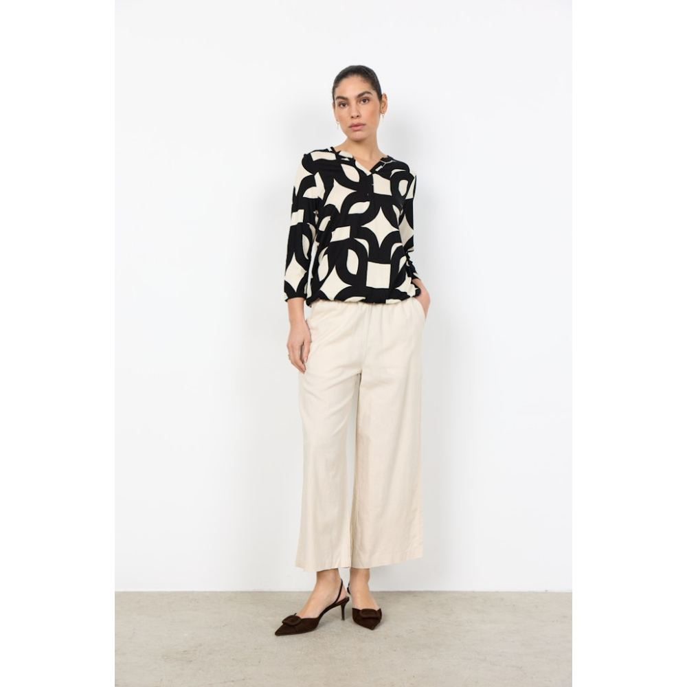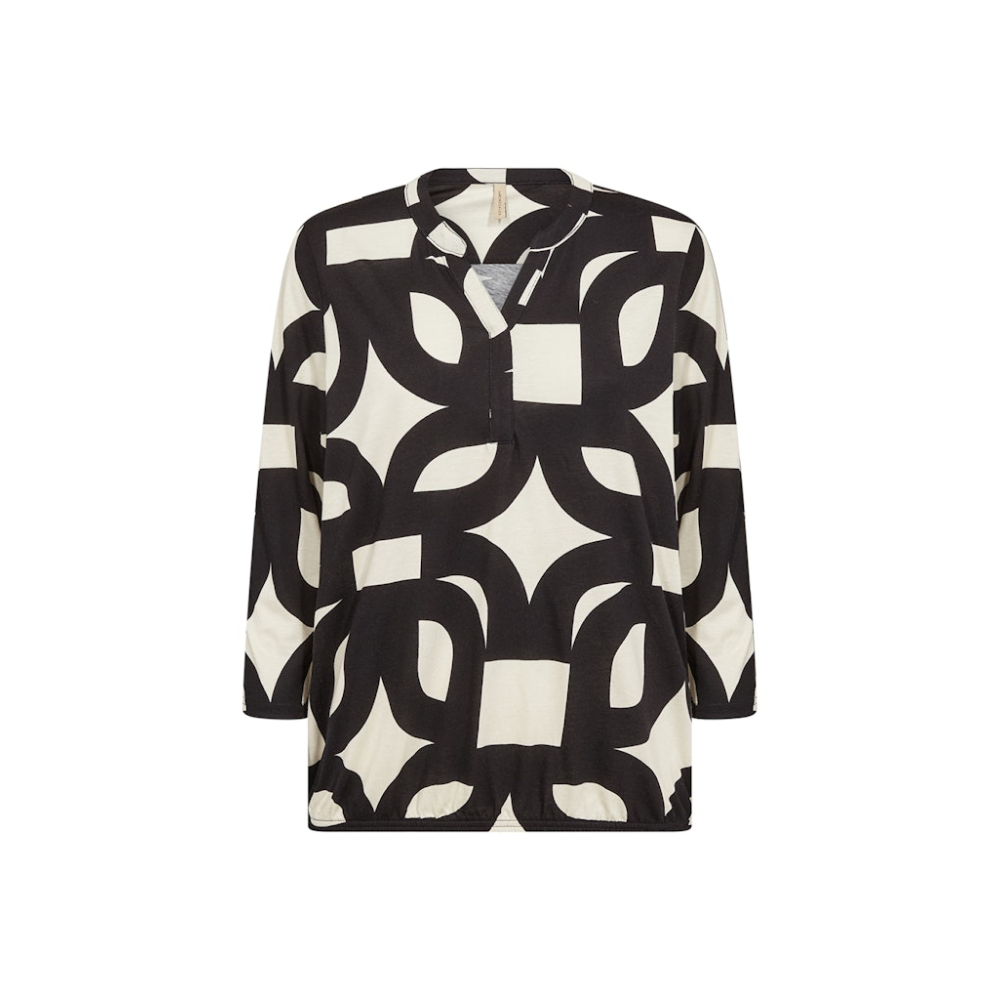 Deze stijlvolle blouse top van Soyaconcept heeft een unieke geometrische print, een subtiele v-hals en halflange mouwen. Deze blouse geeft een stoer accent in combinatie met een getailleerde broek of denim.