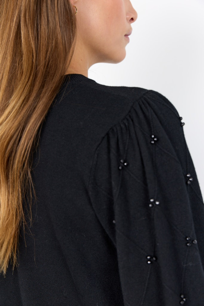 Op de geplooide mouwen zijn kralen gestikt voor een sierlijk en stijlvol detail.