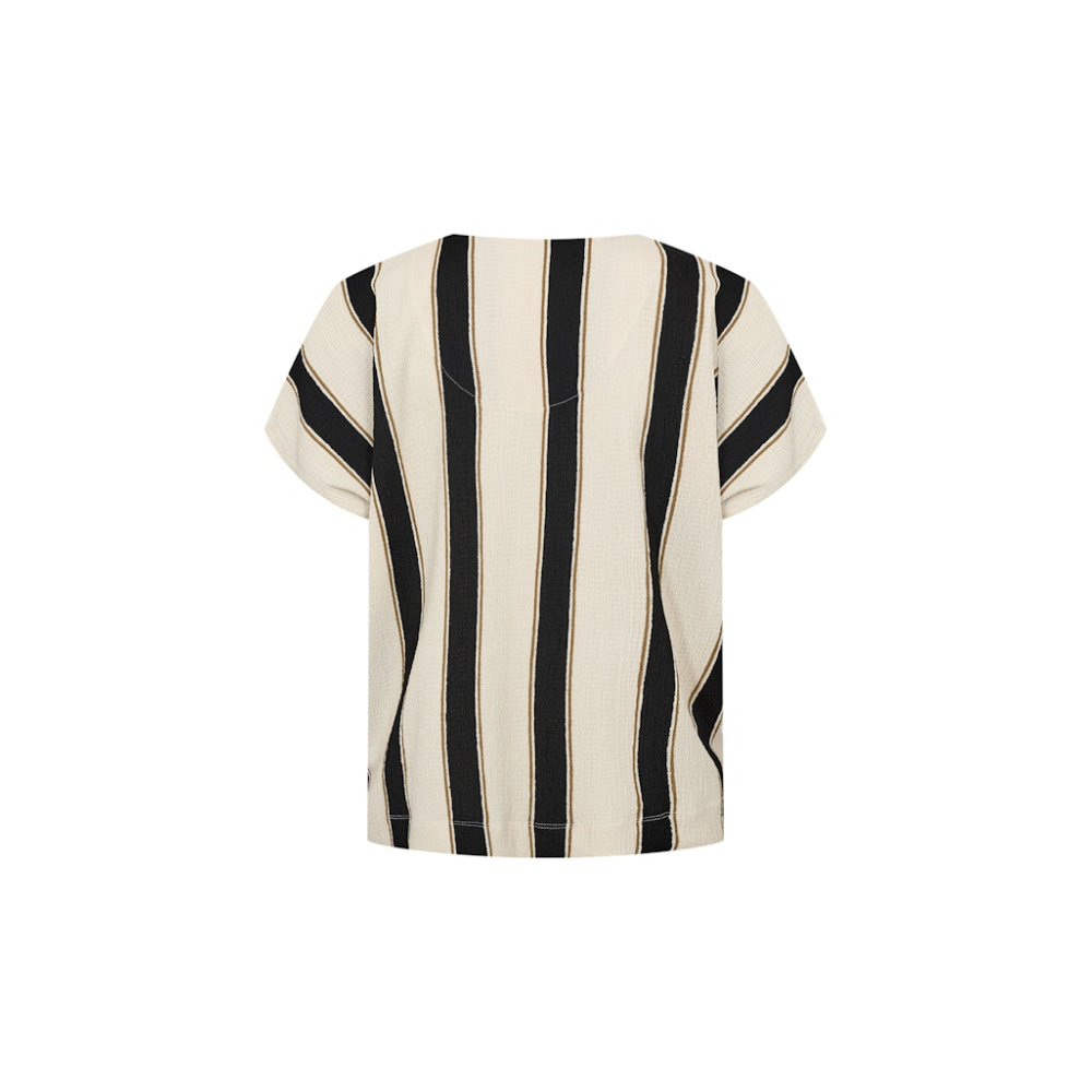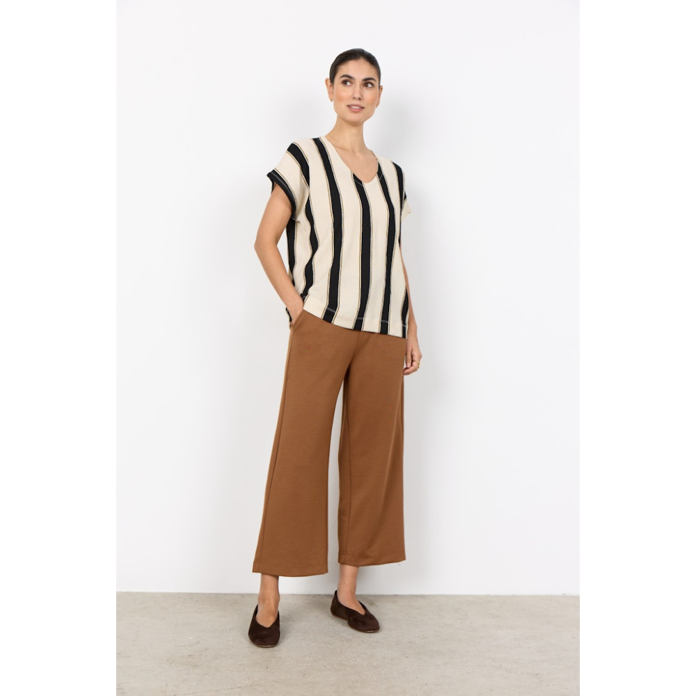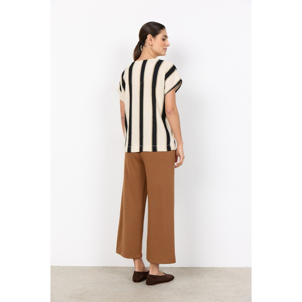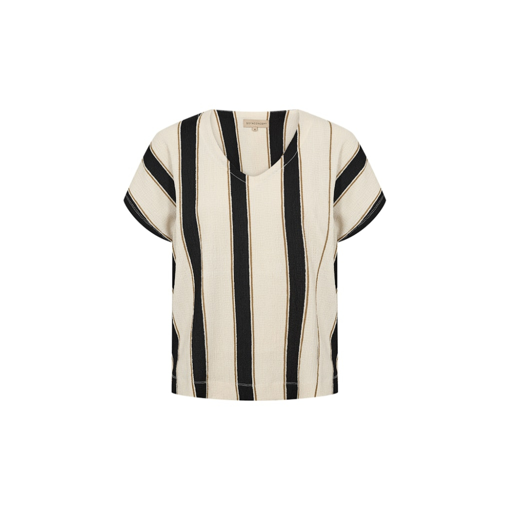 Dit comfortabele shirt van Soyaconcept heeft een ronde hals, korte mouwen en een gedurfd verticaal streeppatroon. Combineer het met jeans of een rok voor een coole en elegante look.