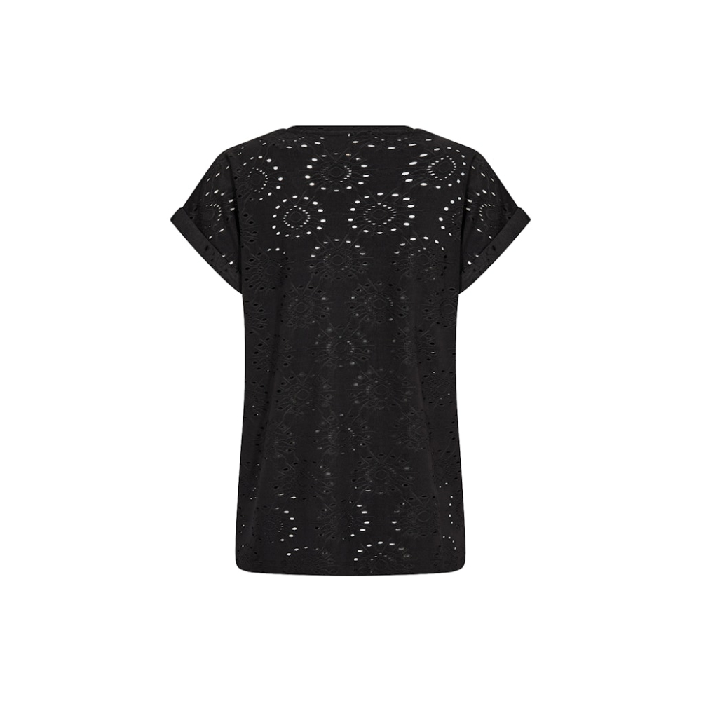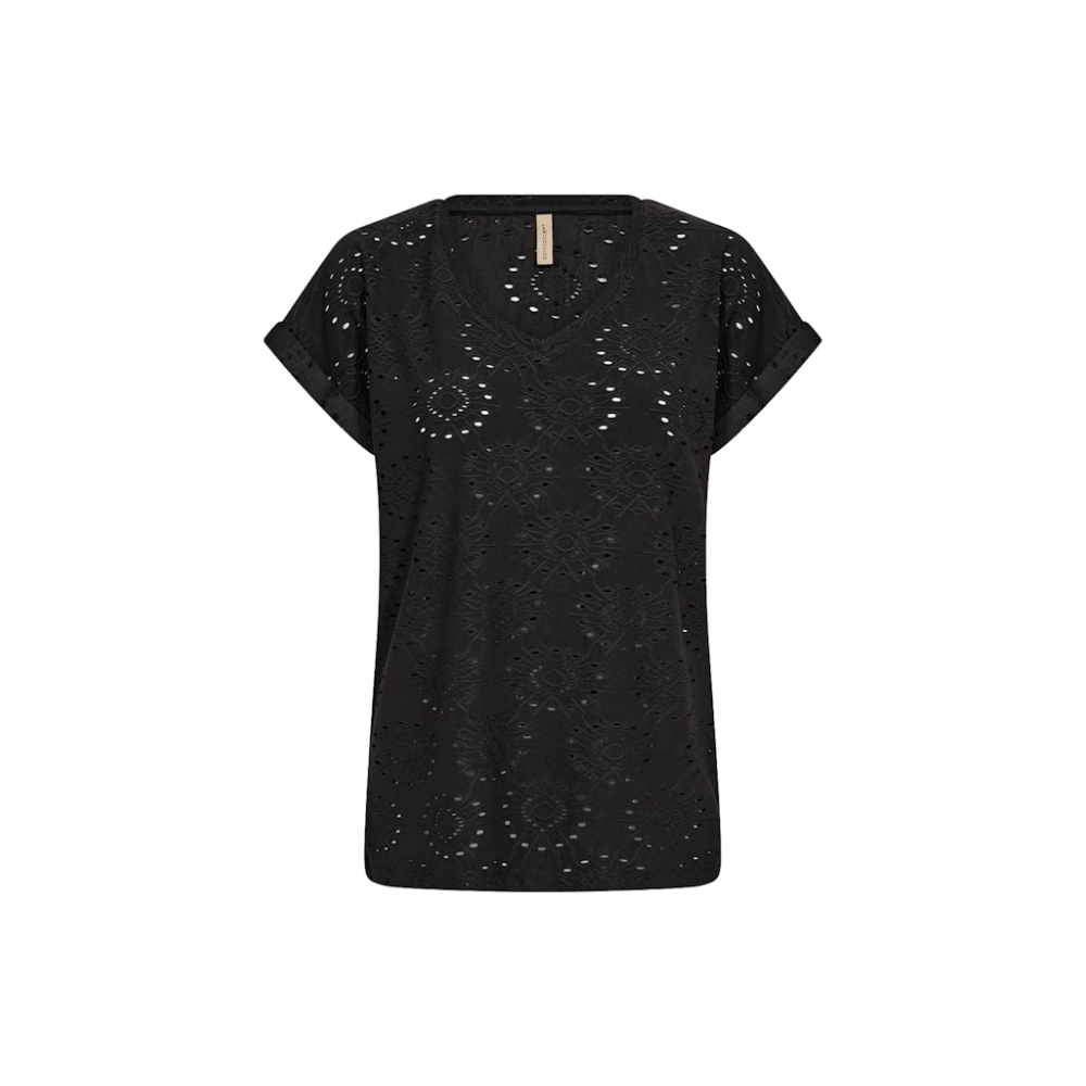 Stijlvol shirt van Soyaconcept met een V-hals, korte mouwtjes en een elegant opgewerkt patroon. Dit shirt combineer je makkelijk met een jeans of tot een gelaagde look met een jasje.
