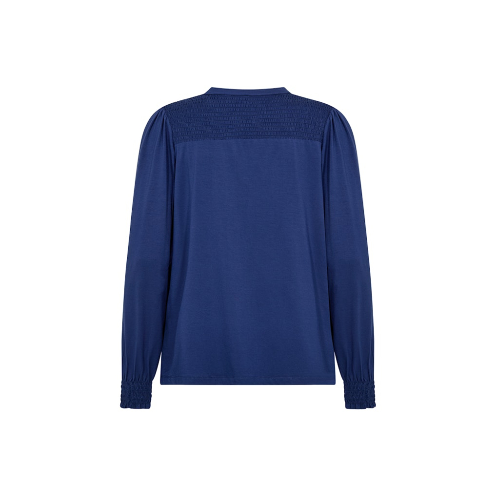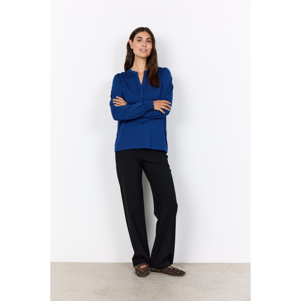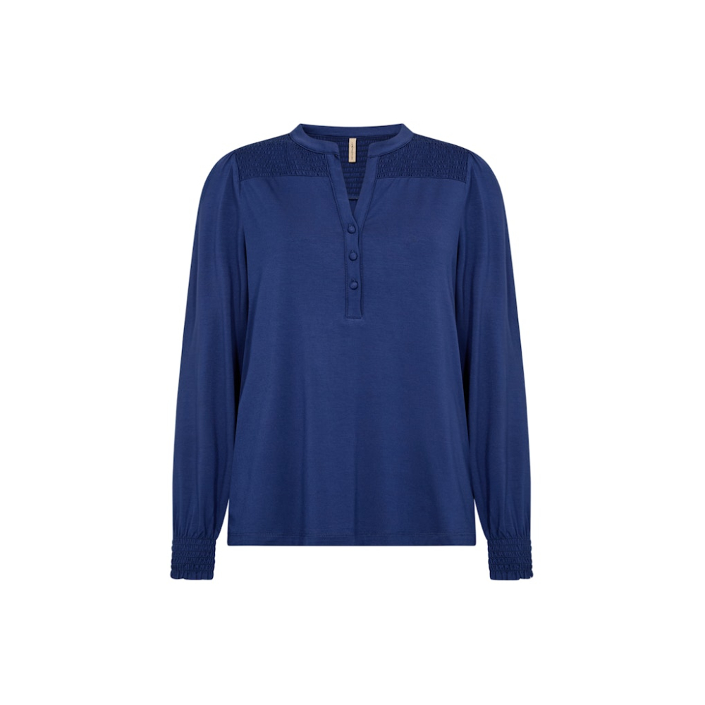 Zacht comfortabel shirt van Soyaconcept met een gespleten halslijn, plooitjes op de schouder en ballonmouwen. Loose Fit Gemaakt van 93% lyocell en 7% elastaan Kleur : Estate Blue