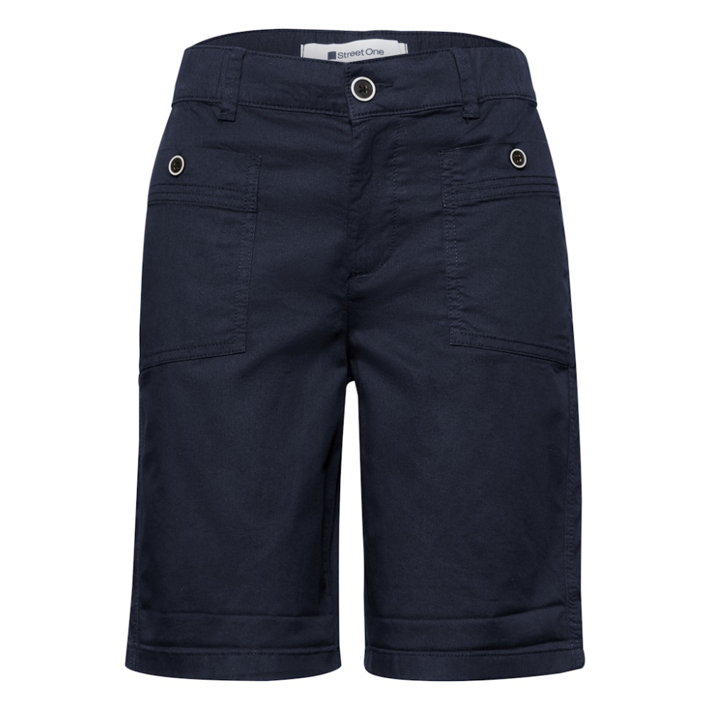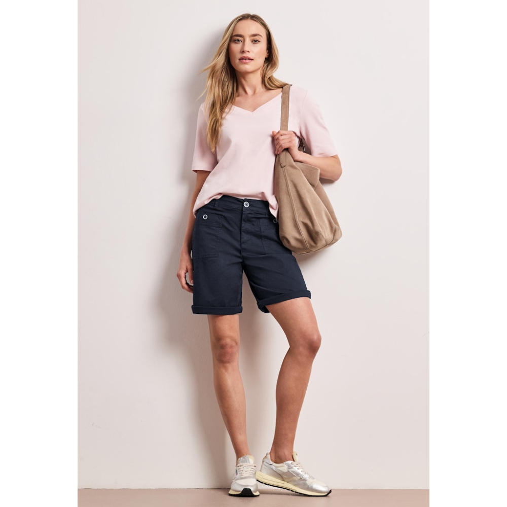Een sportieve bermuda short van Street One in de Yulius stijl met een omslagje. Deze bermuda is met zijn opgestikte steek- en achterzakken de perfecte zomerse allrounder.