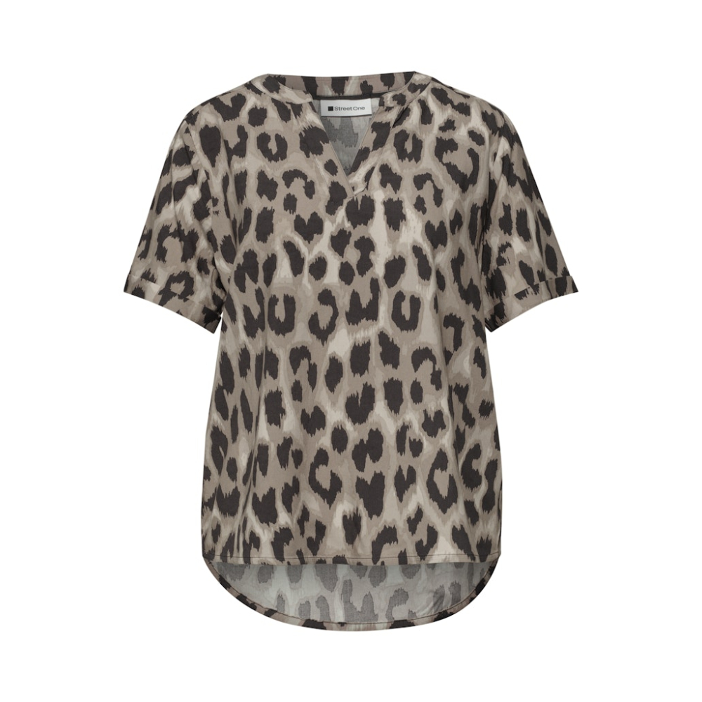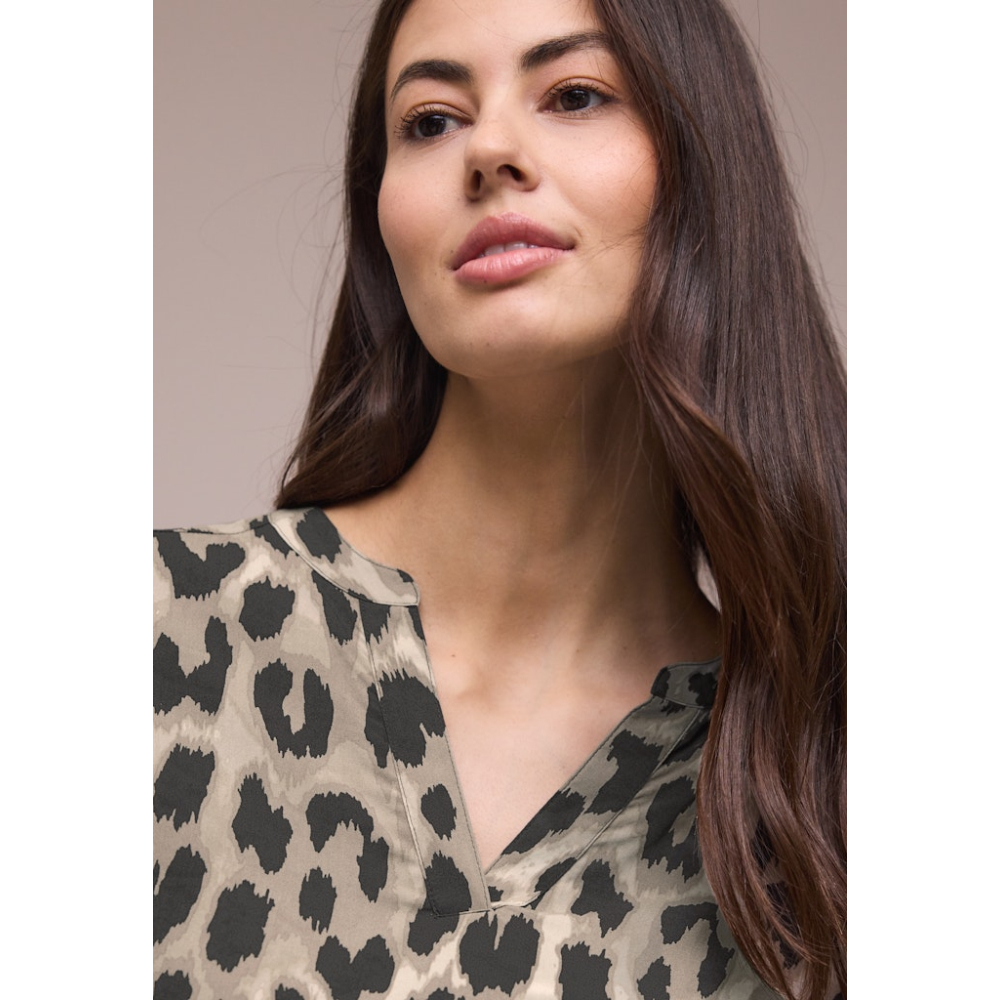Deze comfortabele blouse top van Street One heeft een dierenprint, gespleten V-hals en korte mouwtjes. Gemaakt van 100% viscose Kleur : Timeless Beige