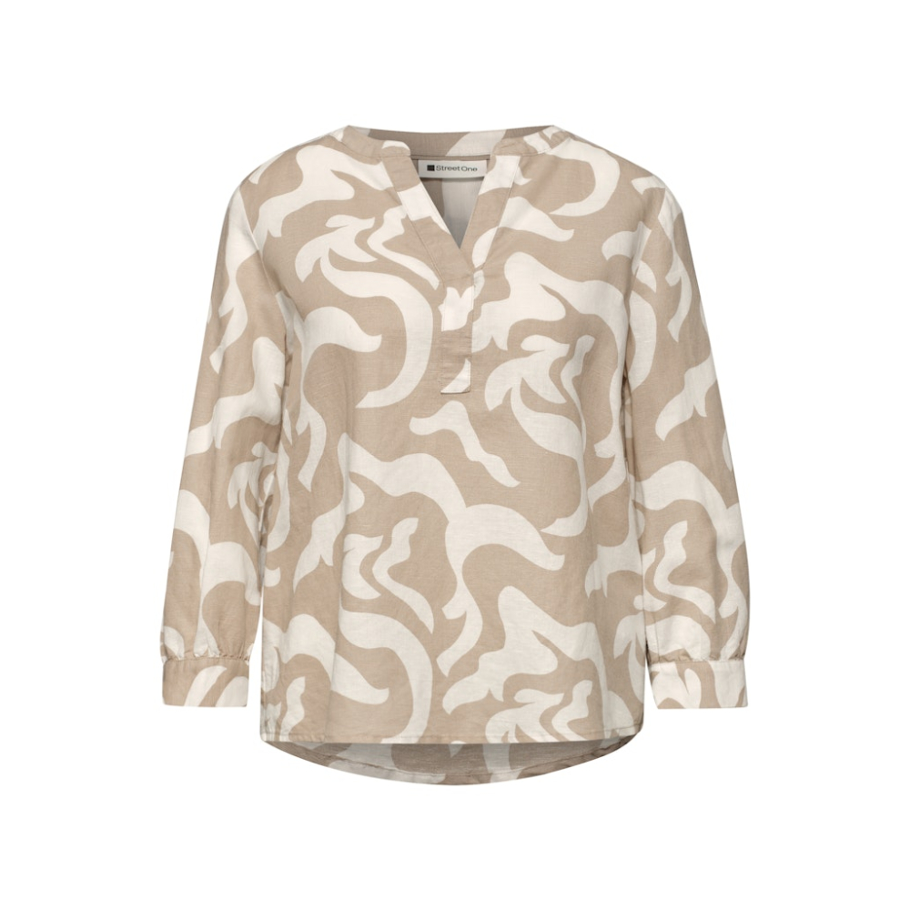 Lichte, zomerse blouse top van Street One met een stijlvolle print, gespleten V-hals en 3/4 mouwen met smalle manchetten en knoop. Gemaakt van 60% linnen en 40% katoen Kleur : Timeless Beige