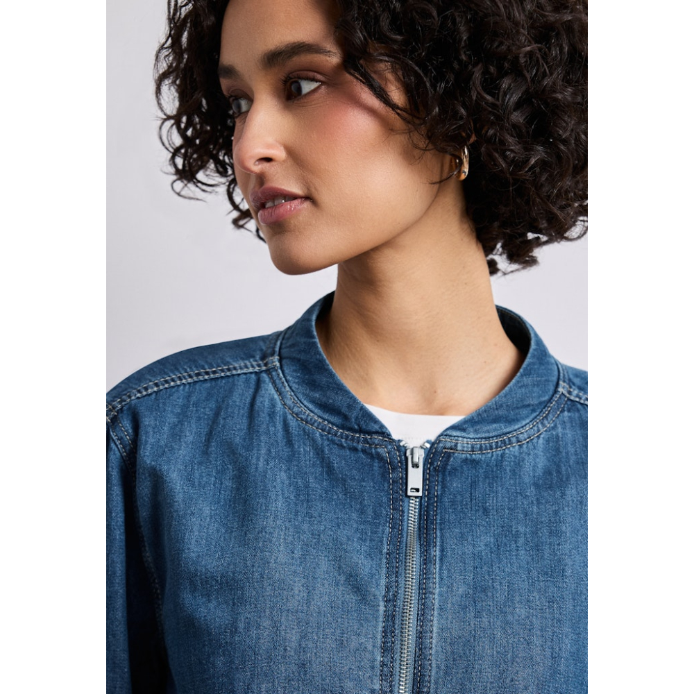 Denim look bomber jasje van Street One met een ronde hals en zijzakken. Ideaal voor stijlvolle vlotte looks met een sportieve touch. Gemaakt van 100% katoen Kleur : Medium Blue Washed