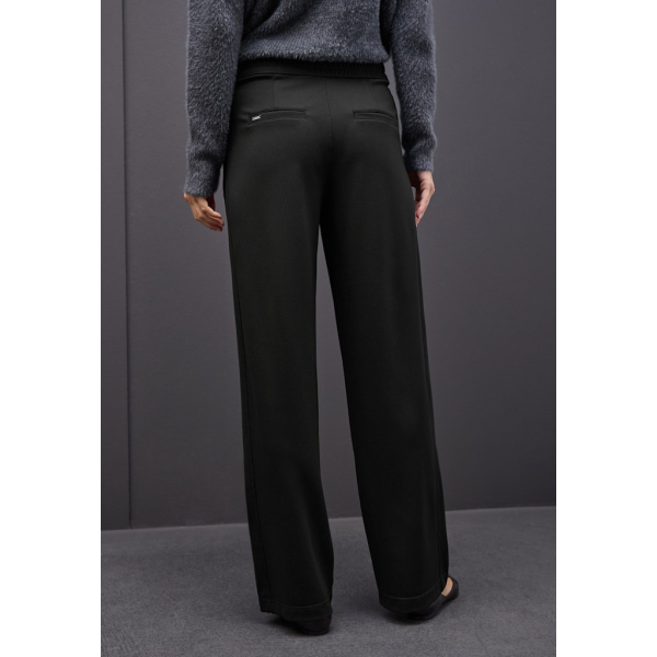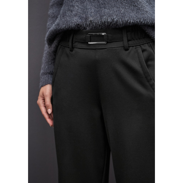 De nonchalante pasvorm en hoge taille creëren een vrouwelijk en toch ontspannen silhouet.