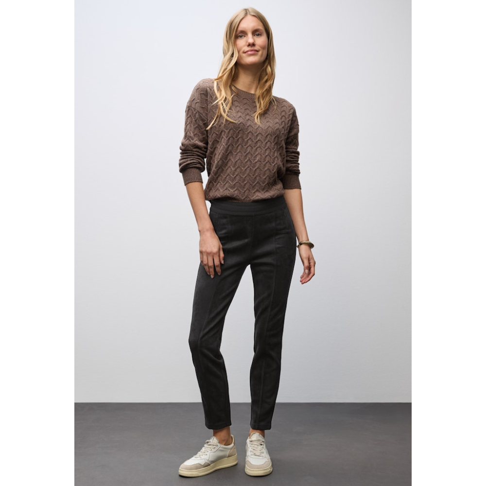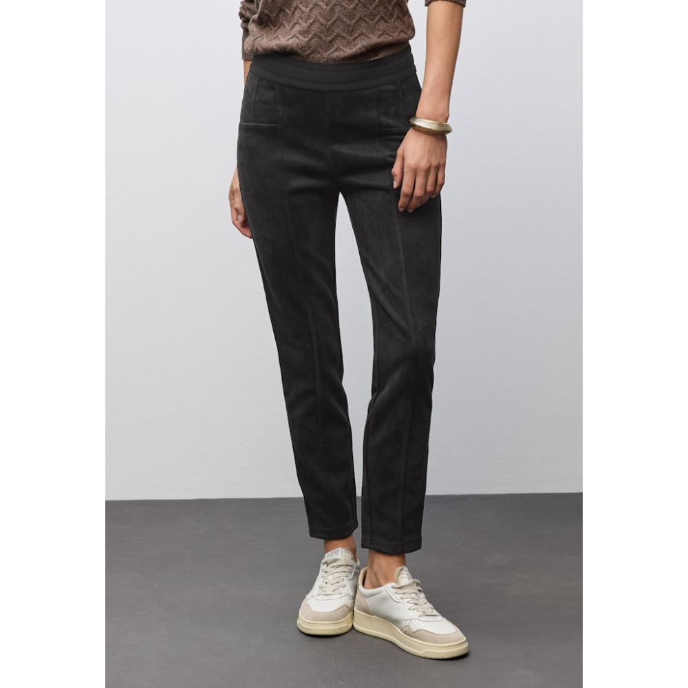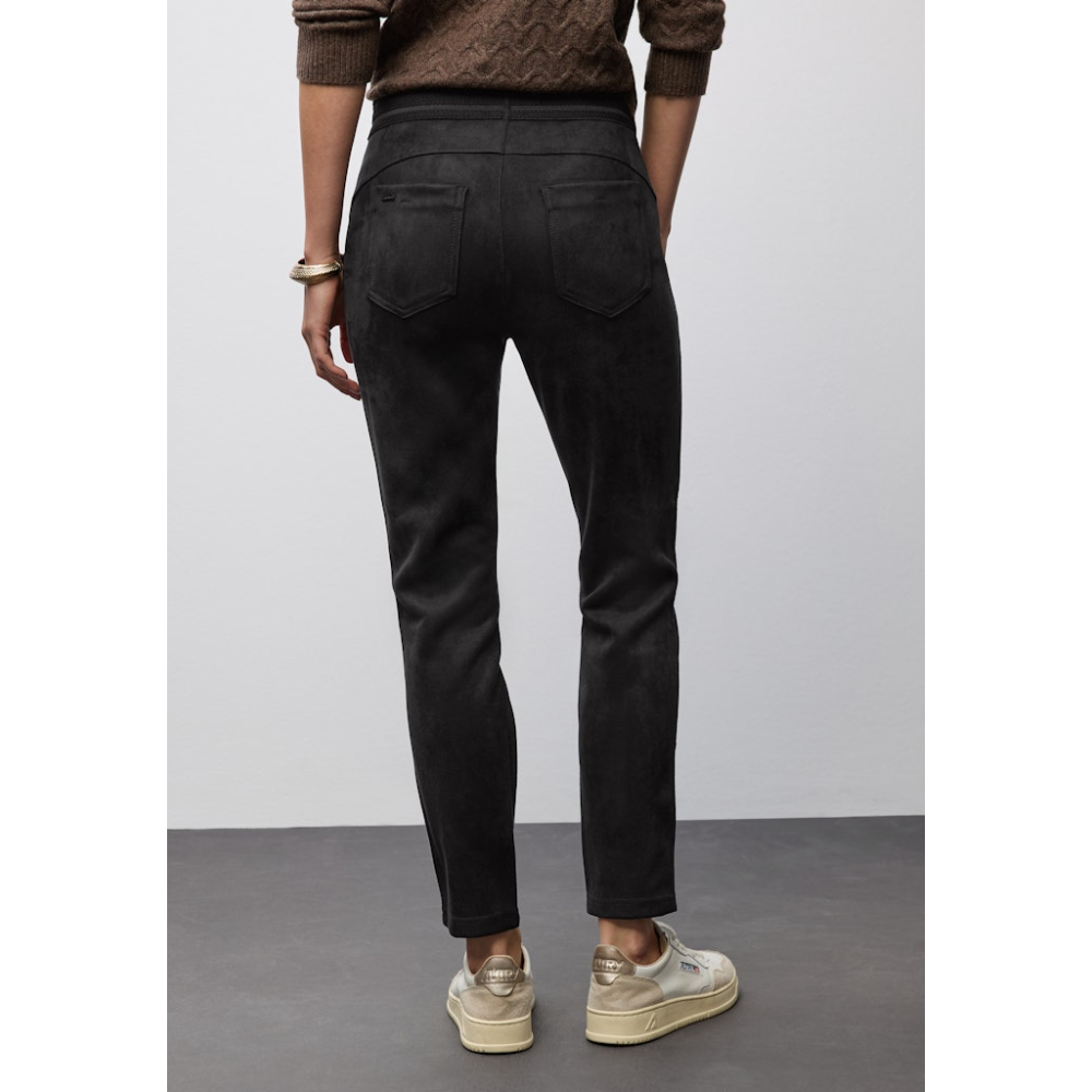 De Hope broek van Street One van zacht velours heeft een hoge taille en skinny legs. De broek heeft een comfortabele tailleband en fijne pasvorm. Kies een maat groter voor een casual fit.